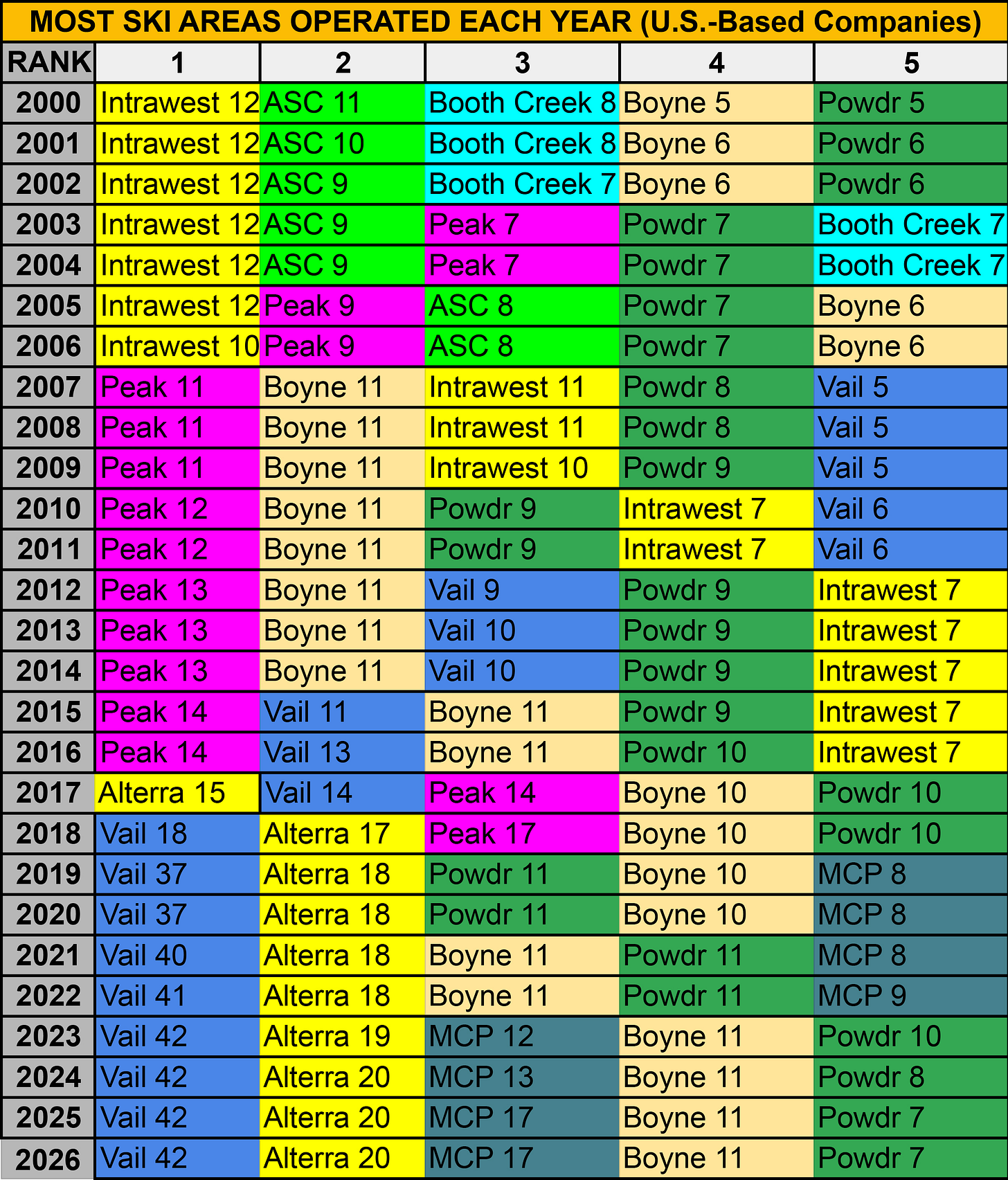 It just wasn’t clear who that someone or something would be. Plenty of operators seemed positioned to challenge Vail’s dominance. Missouri-based Peak Resorts matched Vail in number of ski areas, but it lacked a western anchor resort. Boyne, the quiet, stubborn, family-run survivor, owned 11. Park City-based Powdr, still sore from Vail’s hostile takeover of its hometown resort, ran 10. Once-mighty Intrawest had sold off Whistler, Panorama, Copper, Mammoth, June, and Mountain Creek, but was still hanging around with seven ski areas.