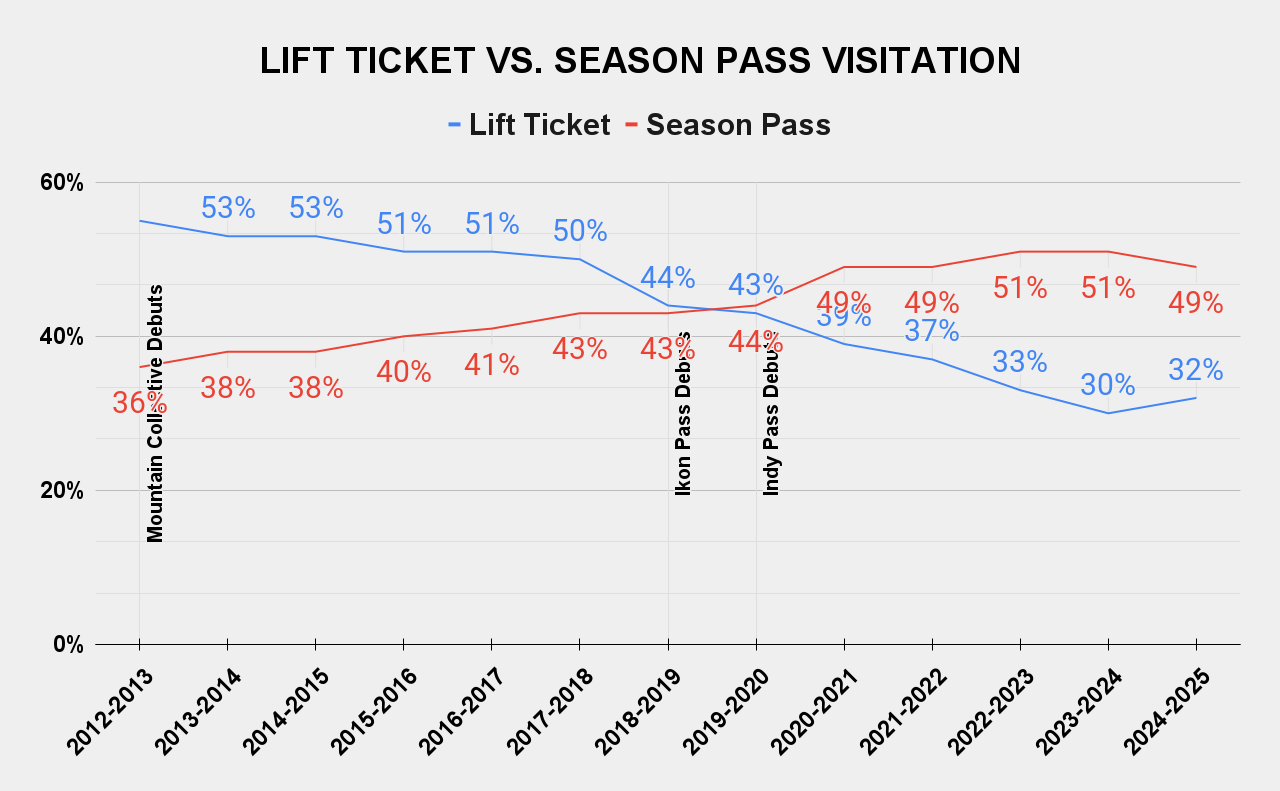 Once that bomb detonated, there was no reassembling it for safe storage. The Ikon Pass altered the lift-served ski landscape instantly and permanently. For ski areas, it normalized the idea that an independent mountain could participate in a larger pass coalition – 242 U.S. ski areas (and 59 percent - 232 of 390 - chairlift-served ski areas), are scheduled to participate in the Epic, Ikon, Indy, or Mountain Collective passes for winter 2026-27. For skiers, Ikon, positioned as a choice against Epic, reset their understanding of what a season pass was and who was allowed to own one, creating a sense of belonging that had been more elusive with a lift ticket dangling from their jacket zipper. The number of skier visits attributed to season pass holders exploded, and within a couple of years had passed the 50 percent mark for the first time.