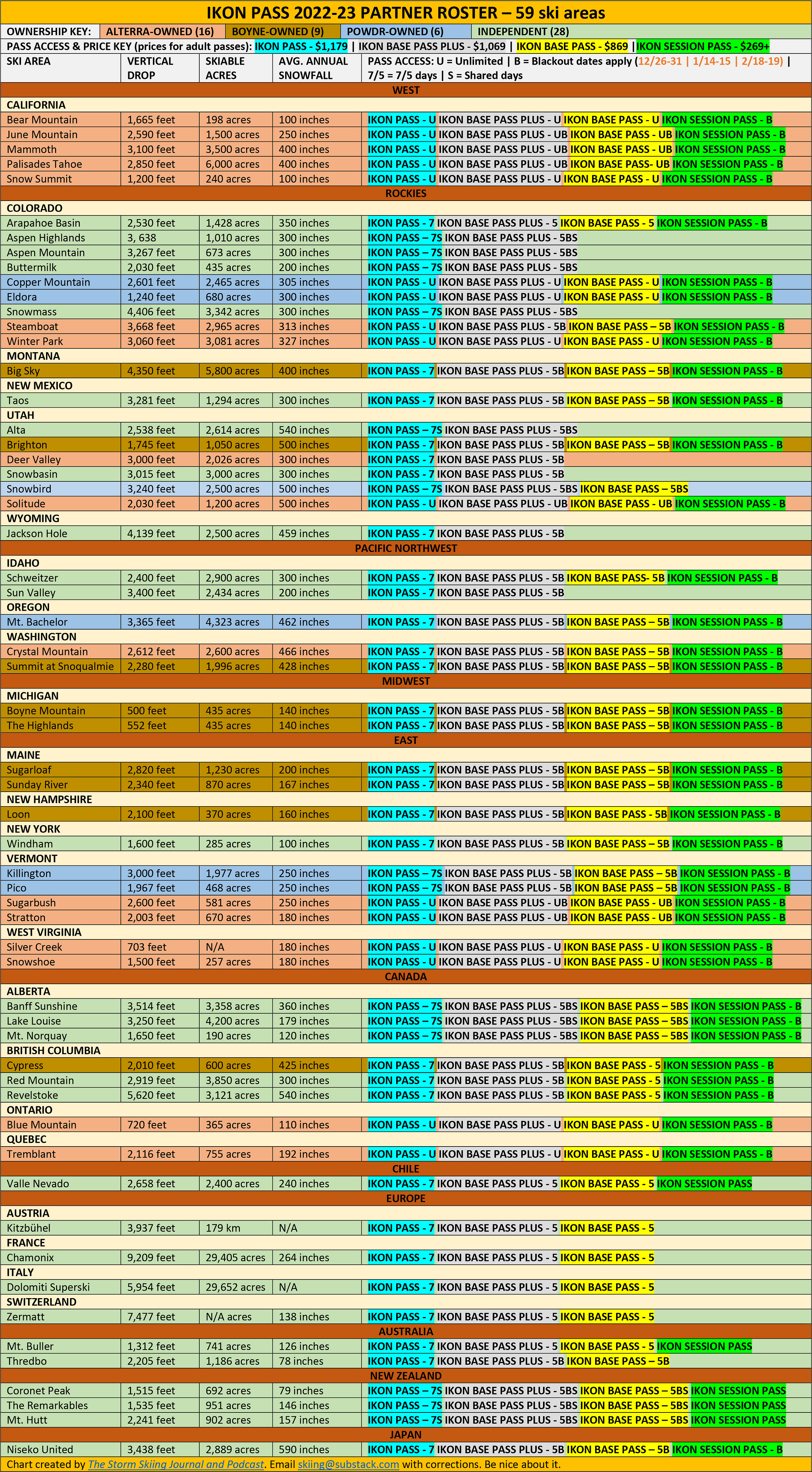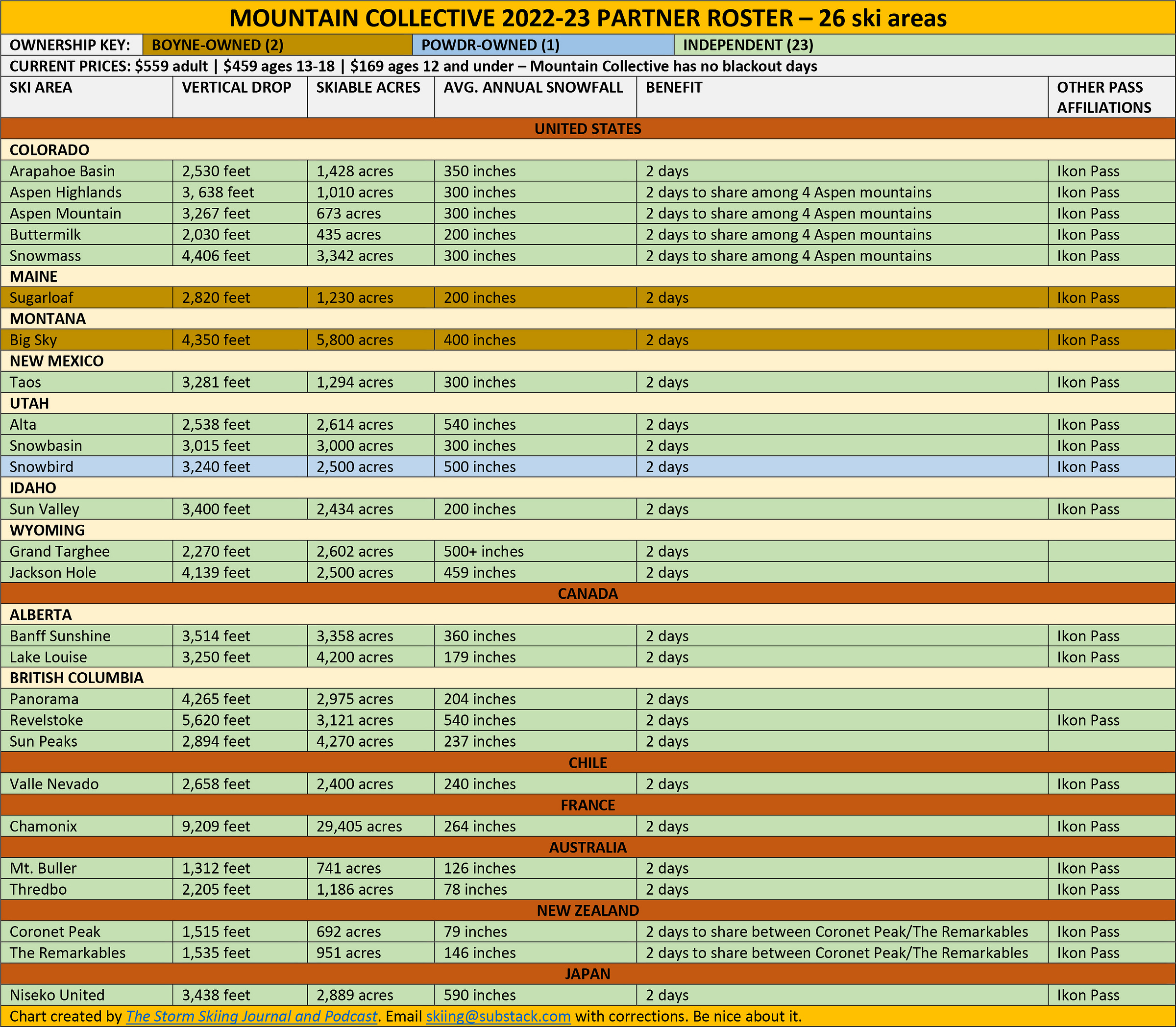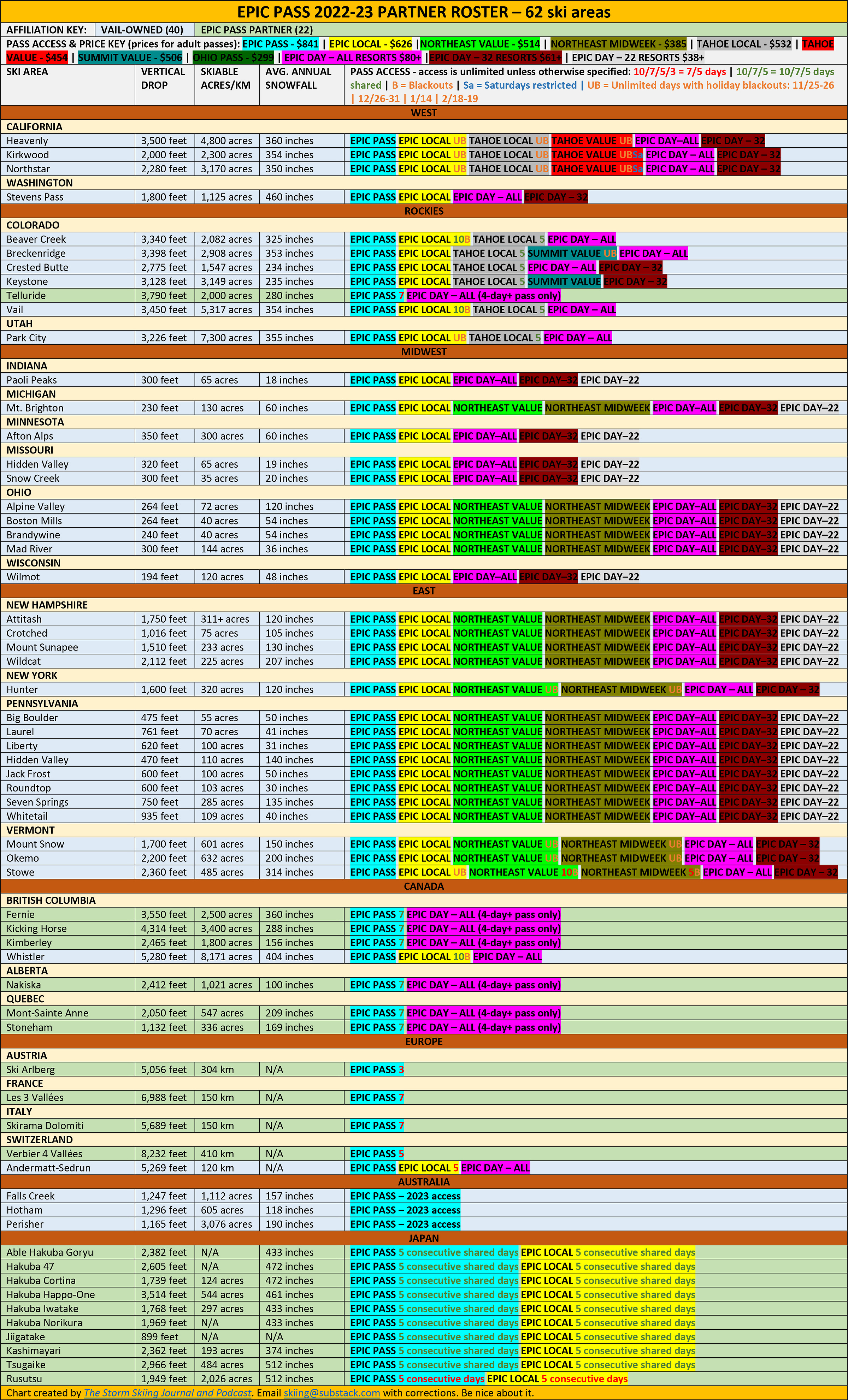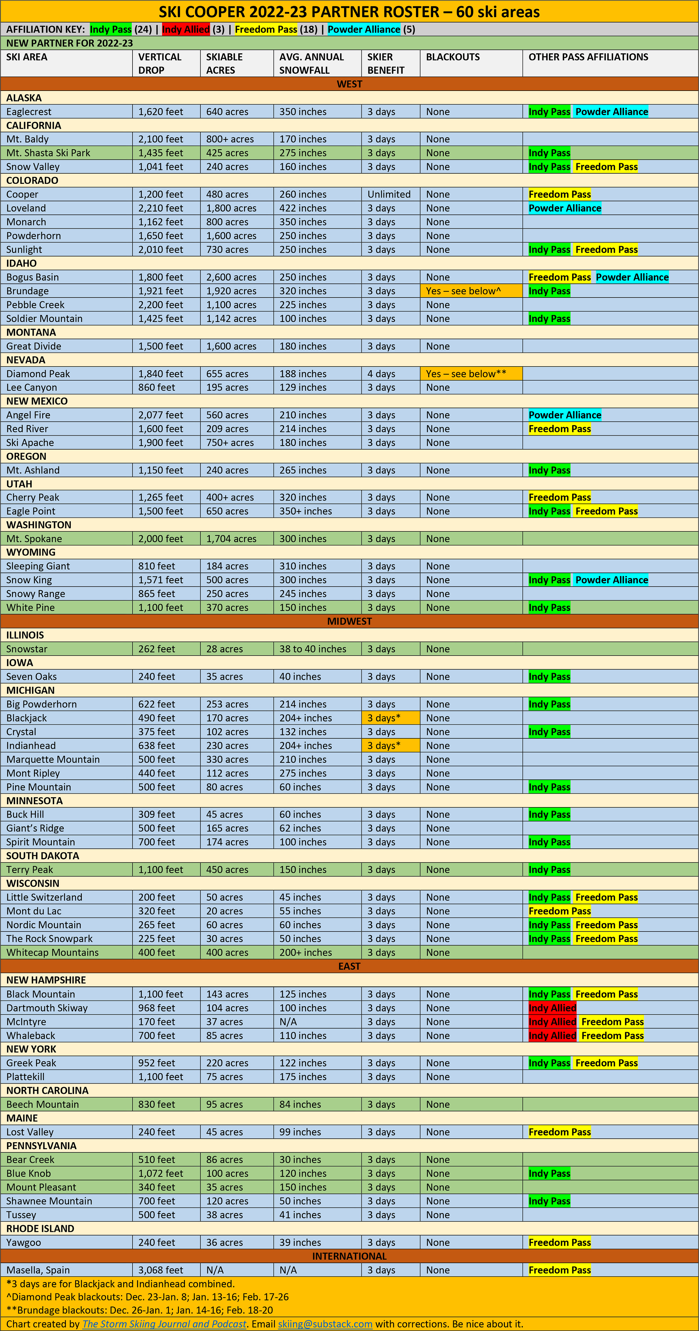 These lists are going to capture 95 percent of the ski areas that most skiers care about. It’s season pass season (though most of the best deals are already gone), so this is when people need to really get their heads right around the sort of access that each pass delivers. I’d already created these charts for Indy and Cooper, so I figured I’d just inventory the rest of the big passes and get something out there. Plus, like I said, I needed the Vail chart for a story I’m working on.
