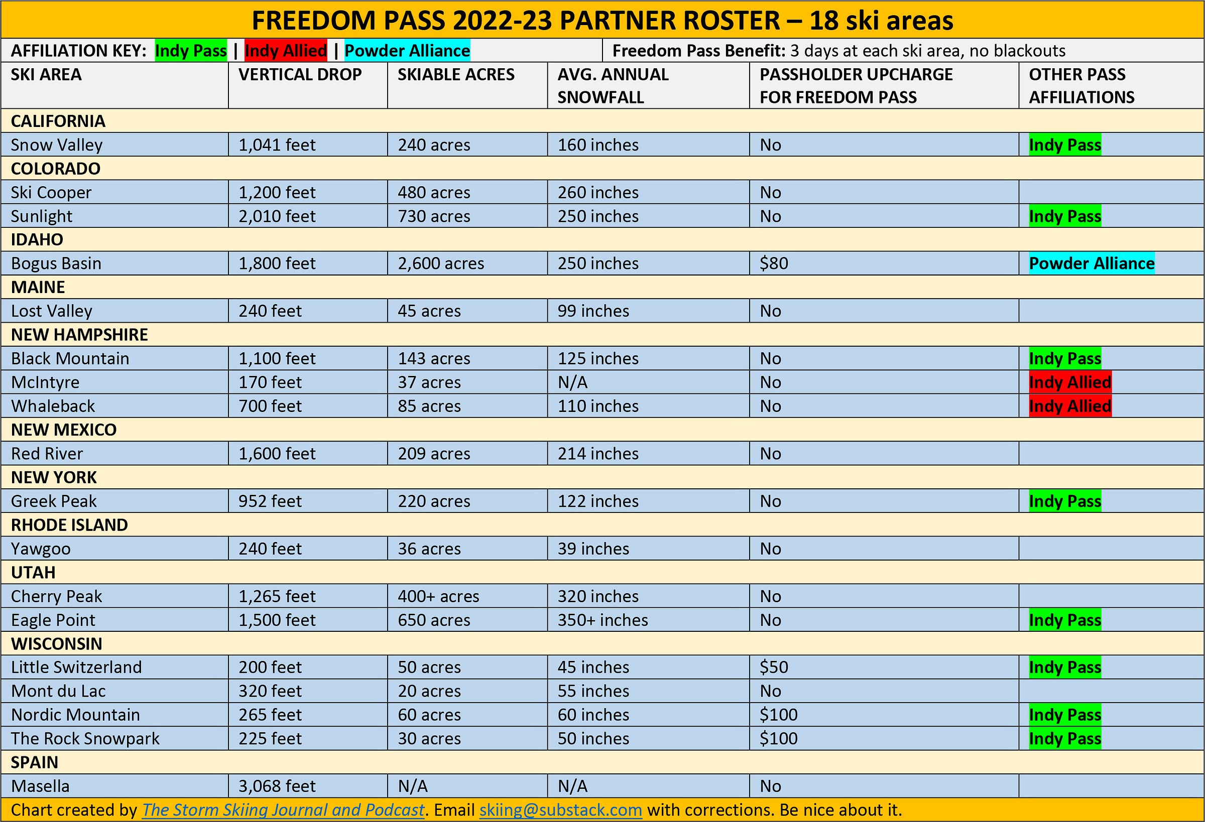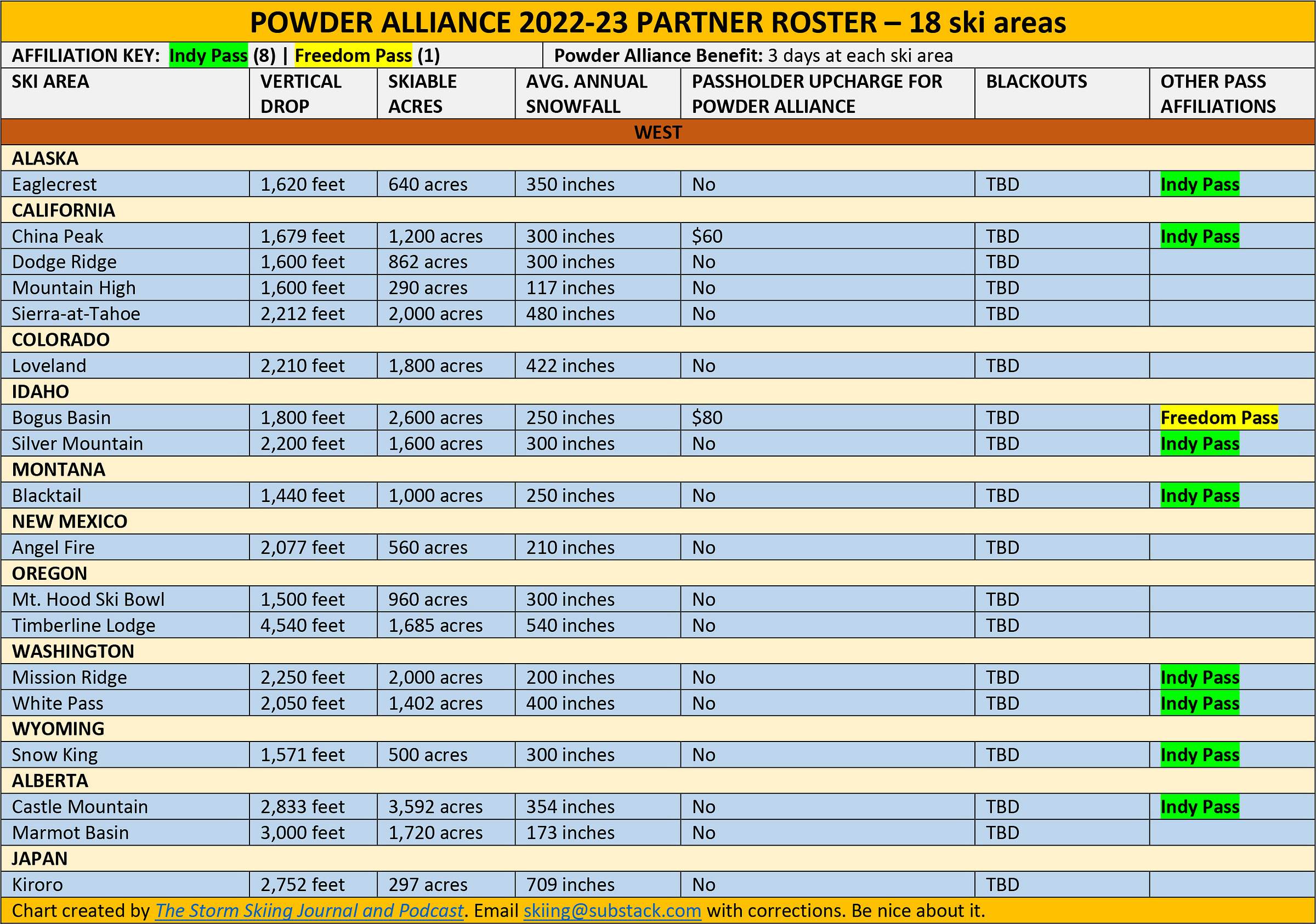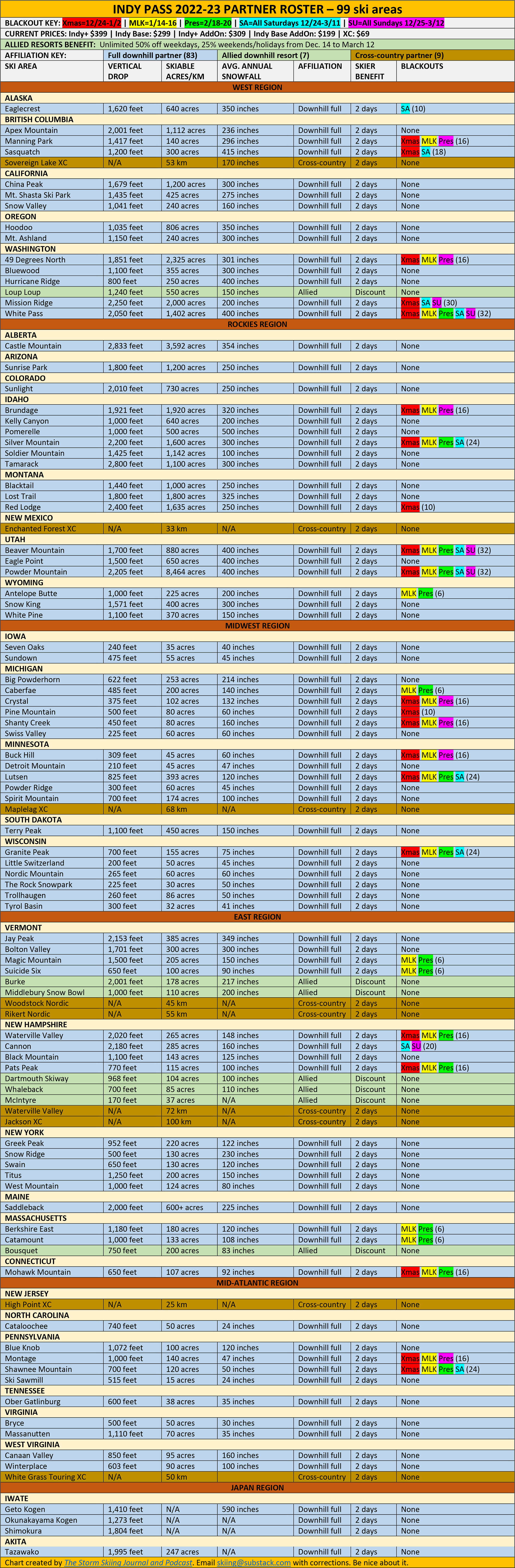 So I began with the numbers I go hunting for most often: those of the ski areas associated with the major multi-mountain passes. I created simple charts organizing every ski area on the Epic, Ikon, Indy, and Mountain Collective passes by region and state. I tracked down the vertical drop, skiable acreage, and average annual snowfall for each, and added some information around pass price and affiliation, as well as blackouts and basic access tiers. I built similar charts for the Freedom Pass and Powder Alliance coalitions, as well as Ski Cooper’s 60-mountain reciprocal pass coalition. You can view them by clicking through below (I’ve also pasted them at the bottom of this article - scroll way down):