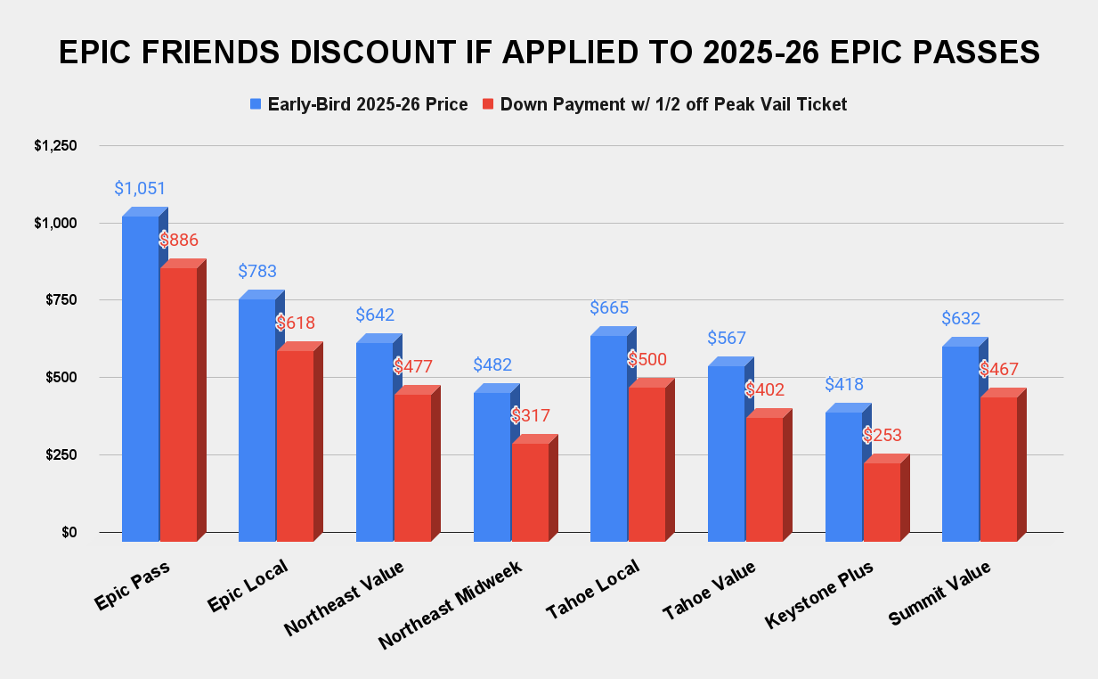 The best part of Epic Friends, however, is not half off lift tickets that sell for three times more than the product’s historical average. The best part is that the friend can then flip the full cost of their discounted ticket into a down payment for a 2026-27 Epic Pass. This not only blunts the still-high-even-at-half-off price of a day of skiing, but it makes the Epic Pass, likely purchased some time later, feel like a great deal (or even better than it already is). Here is the balance owed on early-bird 2025-26 Epic Pass prices had someone been able to apply half of a $329 peak-day 2024-25 Vail Mountain lift ticket as a down payment: