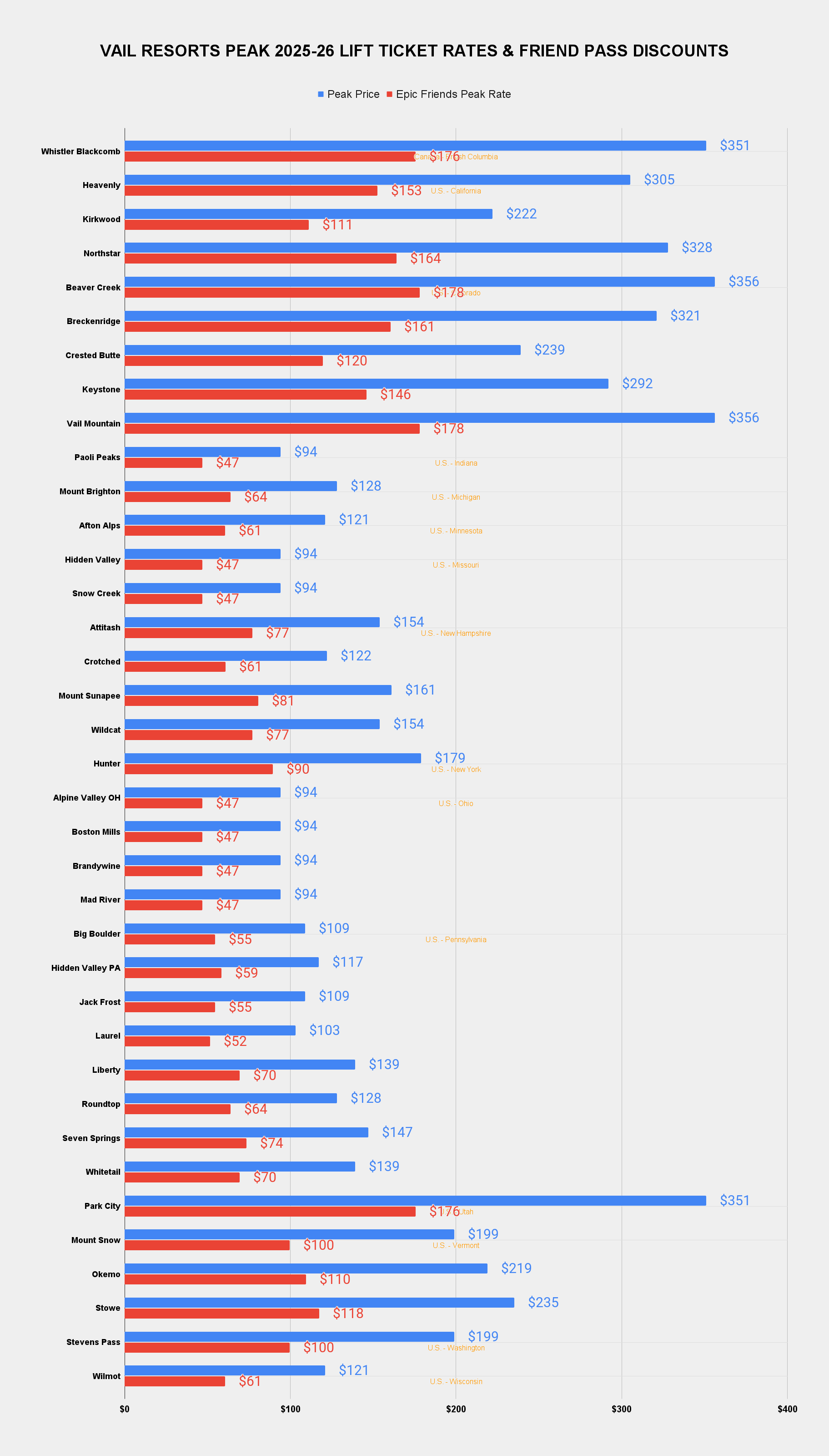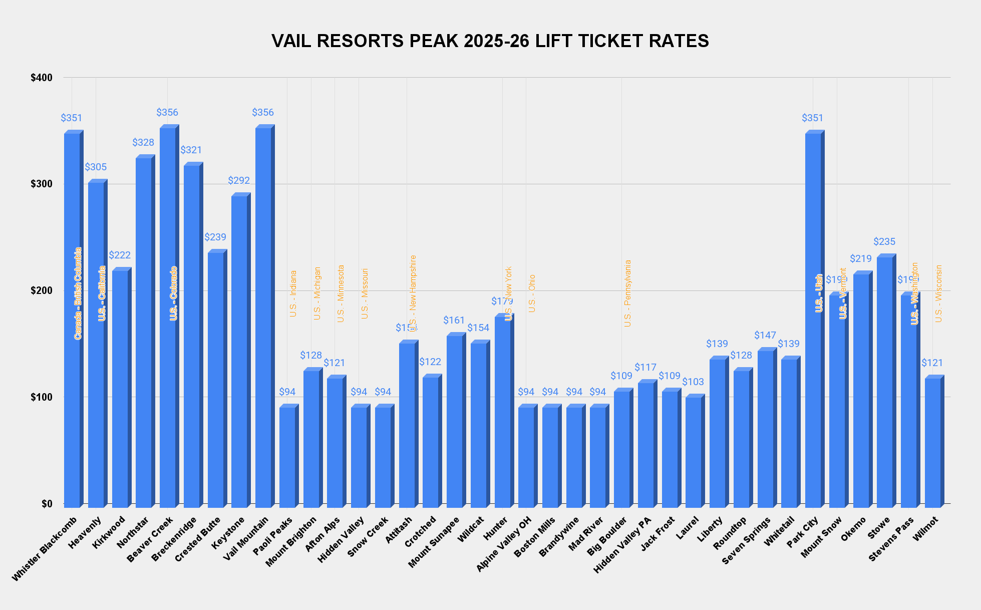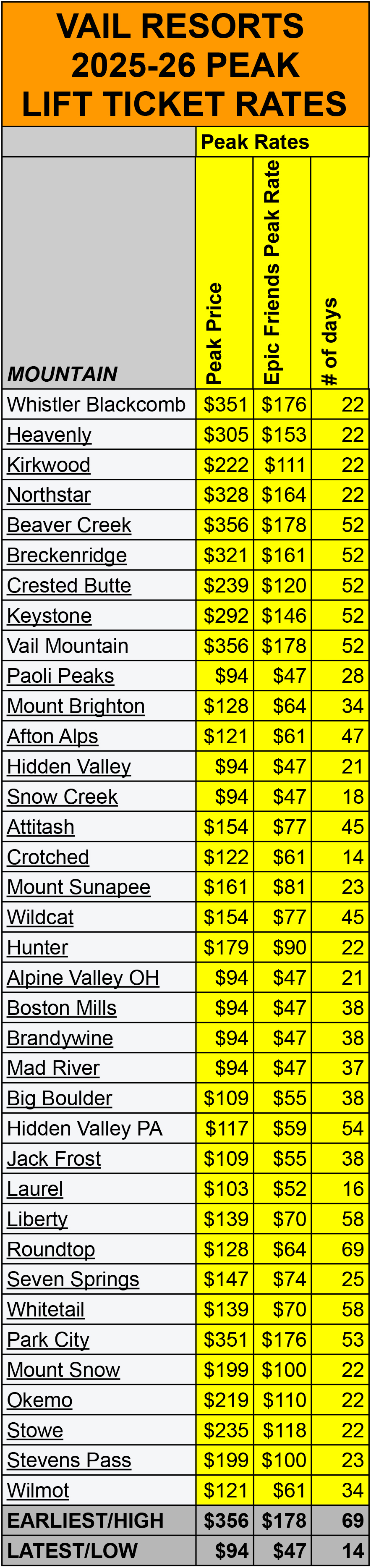 I know these headlines annoy the big ski area operators, who would prefer that I focus on anything but the most-expensive lift ticket prices on the busiest ski days. But you can’t start a fire and be surprised when the firefighters show up. So before we get to the hacks, here are peak rates at Vail’s 37 North American ski areas for the 2025-26 winter (Whistler is in Canadian dollars since apparently they invented their own currency along with their own measurement system; indicating this difference in the spreadsheet baffles the robots, reinforcing my lack of concern that they could mass murder us anytime soon):