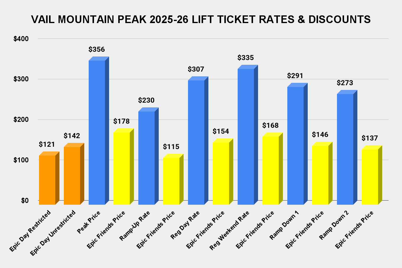 Skiers can cash in Epic Friend tickets any day of the season, of course. Vail Mountain tops out at six different price points across the 2025-26 ski season. Here’s what the Epic Friends discount would look like at each tier (I’ve also included the Epic Day Pass at current rates):