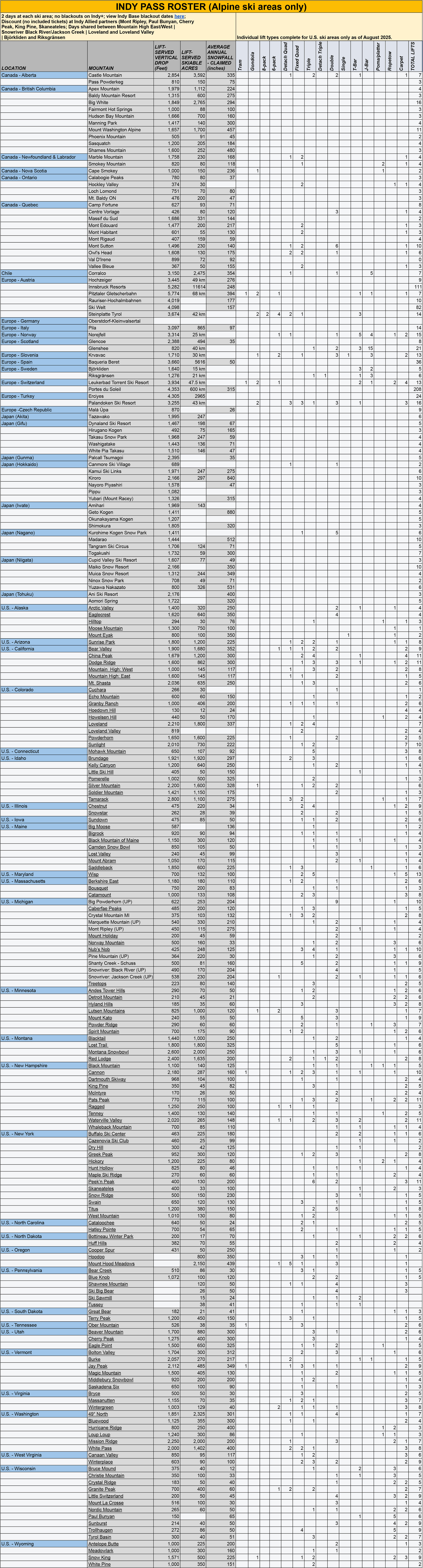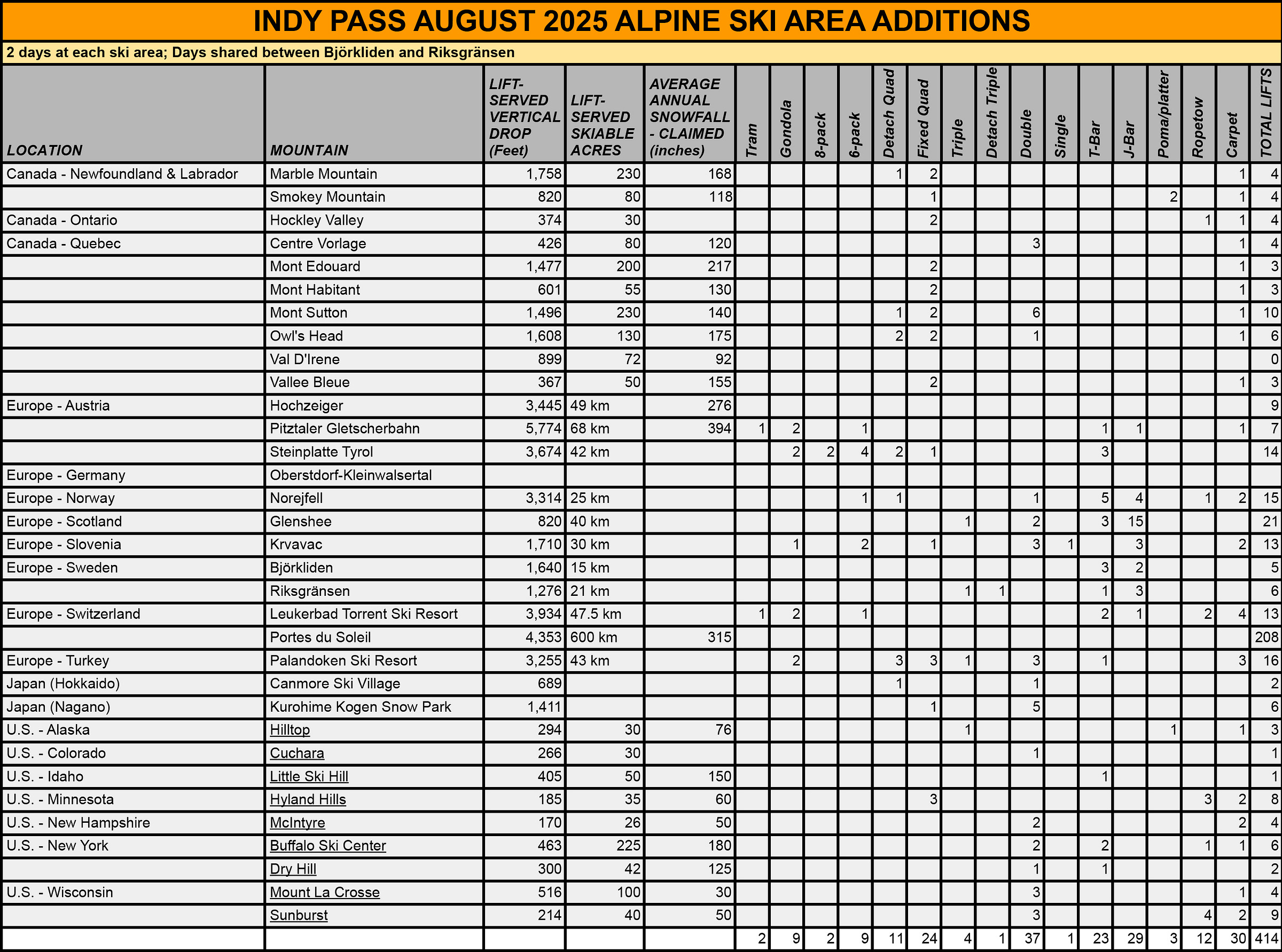 Indy also added five new cross-country ski areas. I no longer actively track XC areas, but the five additions are Bear Basin Nordic, Idaho; Loge Glacier XC, Montana; Plain Valley XC, Washington; Mt. Washington XC, British Columbia; and Leukerbad Gemmi Nordic Resort in Switzerland.