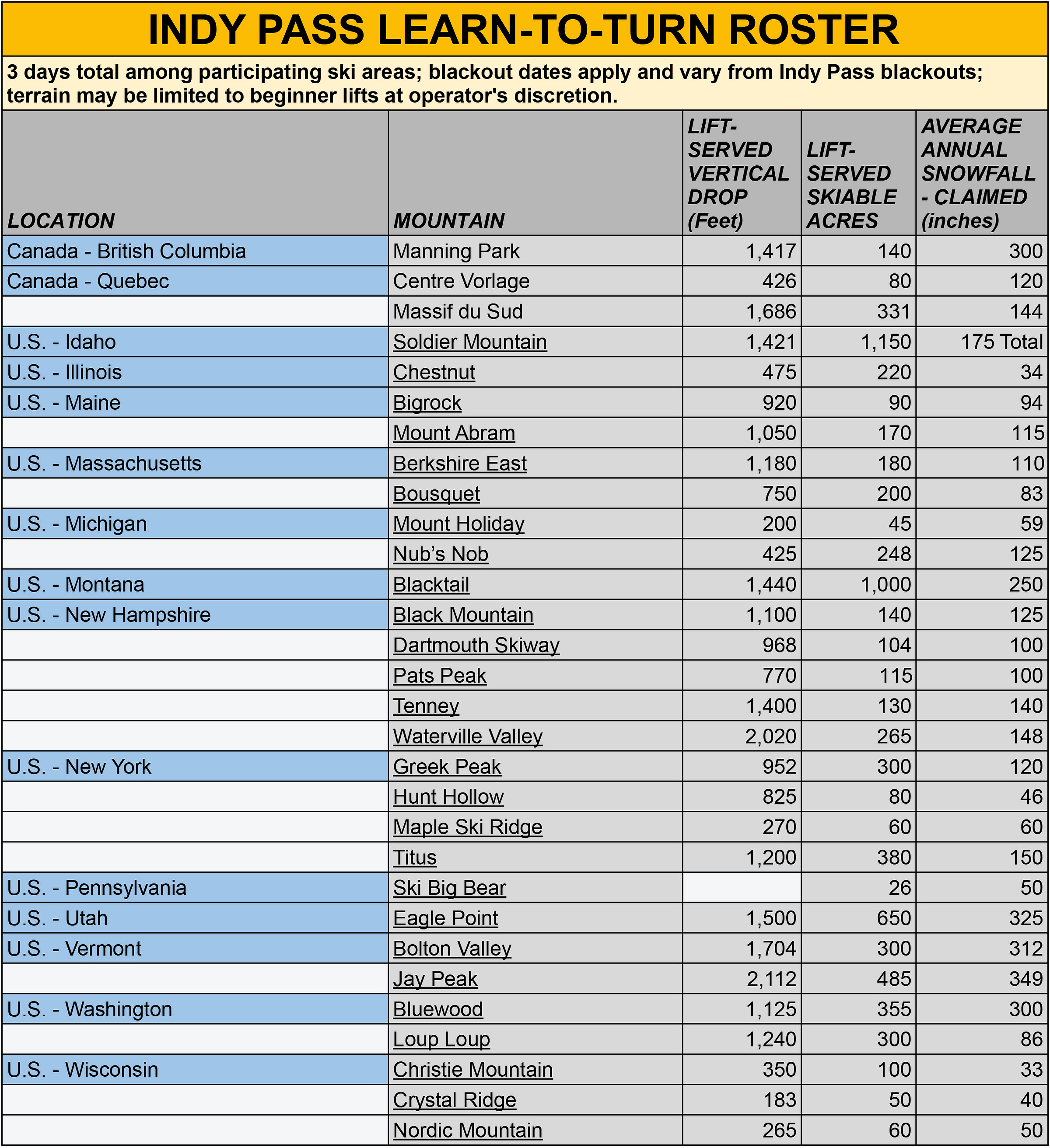 Thirty ski areas – the majority in eastern North America – signed on to Indy’s new three-day Learn-to-Turn pass, which includes a lift ticket, rentals, and a lesson. The pass will remain on sale all year, and Indy Passholders will receive three vouchers for $40 off a Learn-to-Turn pass.