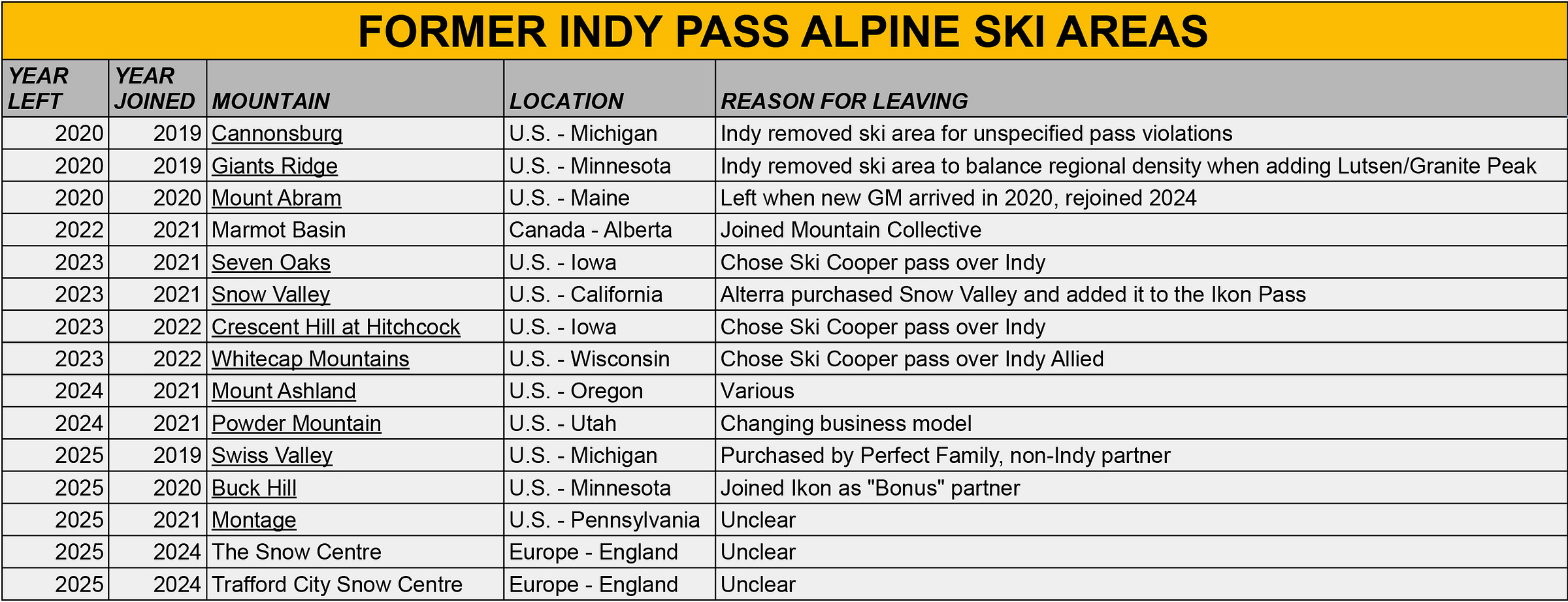 Indy drops five partners that participated last year: two UK snowdomes, and longtime U.S. partners Montage, Pennsylvania; Swiss Valley, Michigan; and Buck Hill, Minnesota. They join a relatively short list of ski areas to exit Indy in its six-year history: