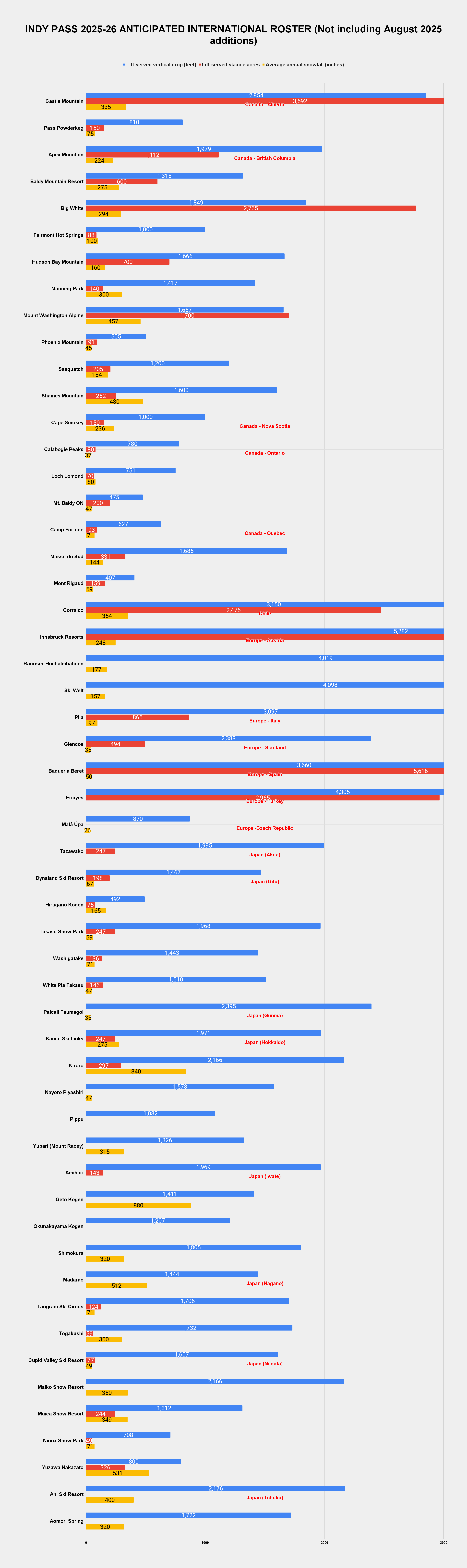 So stand by for all that. In the meantime, here’s Indy’s probable baseline roster for 2025-26. The two indoor snow “centres” in England dropped off after one season. Buck Hill appears to be gone after selling its soul to Ikon (for, I’m told, no per-visit compensation). And I know there’s a lot of confusion around Montage and whether they’re still on Indy. No one has been able to give me a definitive answer, so I’m leaving them on for now. A reminder that I’m no longer tracking the cross-country ski areas. (Chart best viewed in desktop; some numbers overlap below, but if you want to see the crappy old version of the chart with more information, it will always be right here; I split this chart into U.S. and international to help a bit with the number-squeezing):