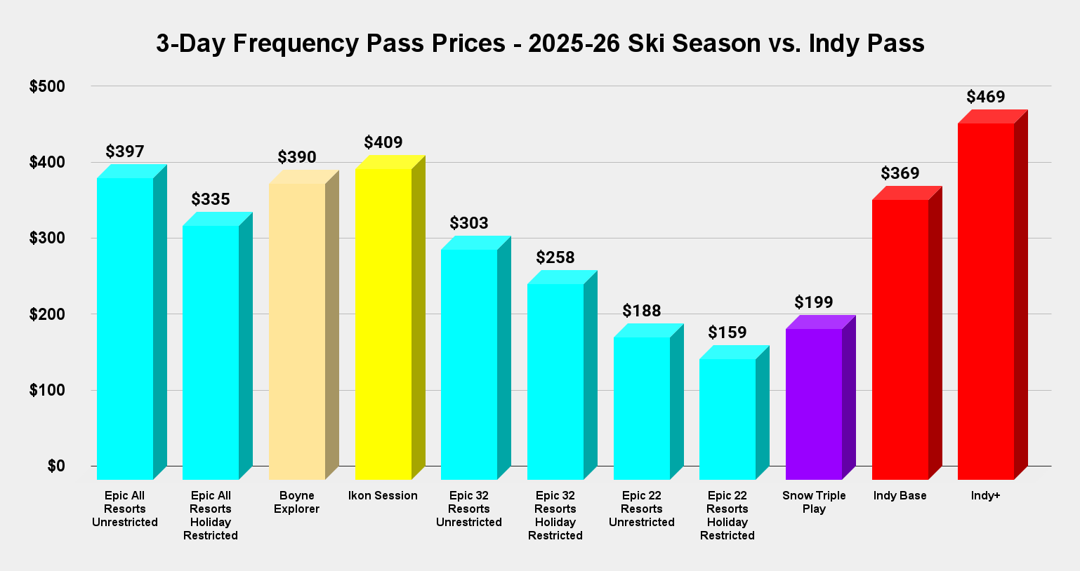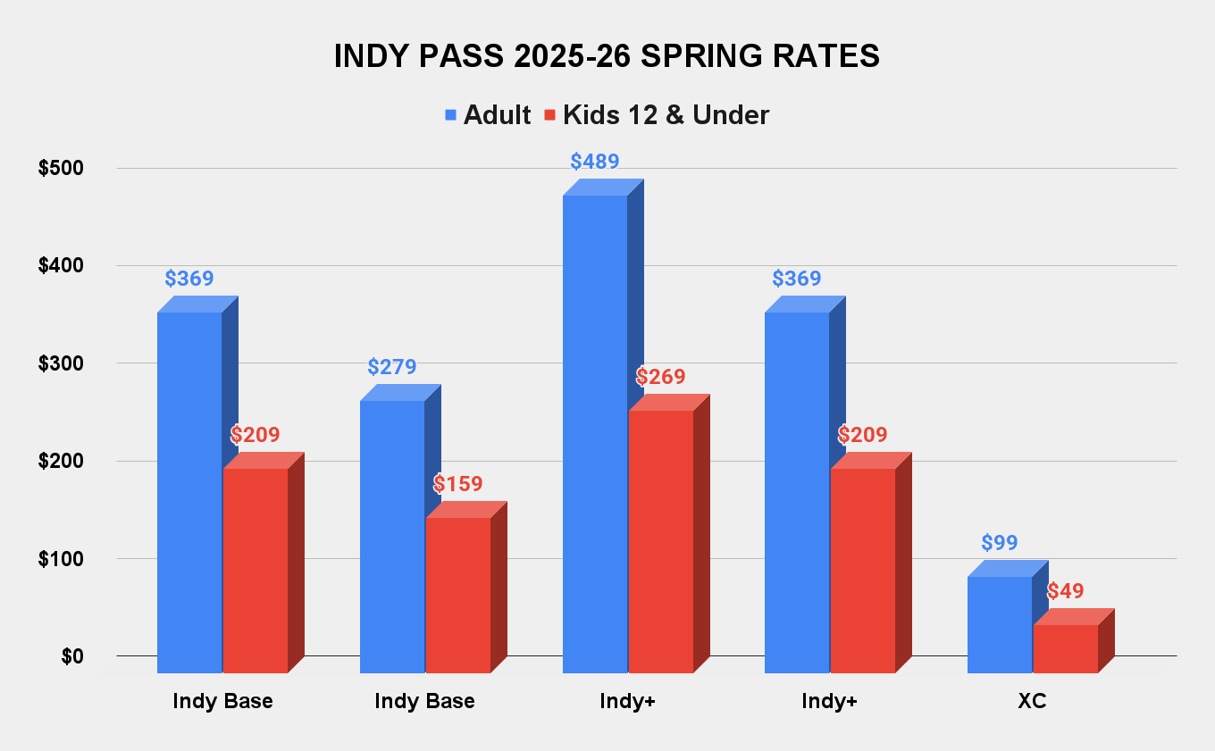 I’m afraid that we’ve normalized the Indy Pass too much. Vail announces half off $300 lift tickets and Snow Partners bundles three ski days for $200 and we’re all like “sick. What a great deal.” But here’s how the adult Indy Pass, with its hundreds of days of skiing, stacks up against three-total-days versions of Epic, Ikon, Boyne and Snow Triple Play (spring rates for Indy versus current rates for all other passes):