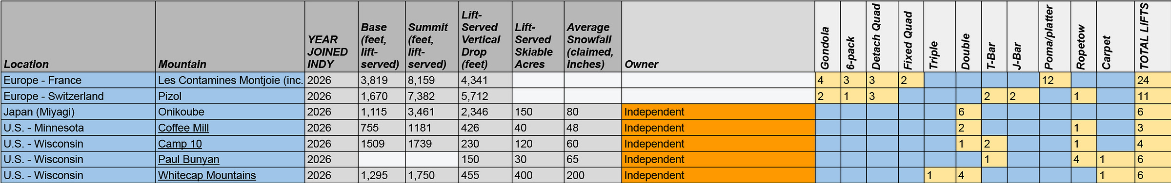 Why, in the era of Epic and Ikon, do I keep beating you to death with the Indy Pass? Because unless you’re the sort who skis 100 days per year at the same mountain or takes a locked-in vacation to the same spot every February, Indy is the most streamlined way to mix up your ski diet. And man, there are A LOT of good dishes out there you probably haven’t tried. With two days each at 233 Alpine ski areas locked in for 2026-27, Indy has built meaningful density across most of the world’s best ski regions. Skiers could spend a couple of months just skipping around Europe (30 ski areas), Japan (29), or Canada (30). In the U.S., Indy offers 143 Alpine ski areas, with 50 in the West, 55 in the East, and 38 in the Midwest. Yesterday, Indy added seven more Alpine ski areas to that ever-growing roster: