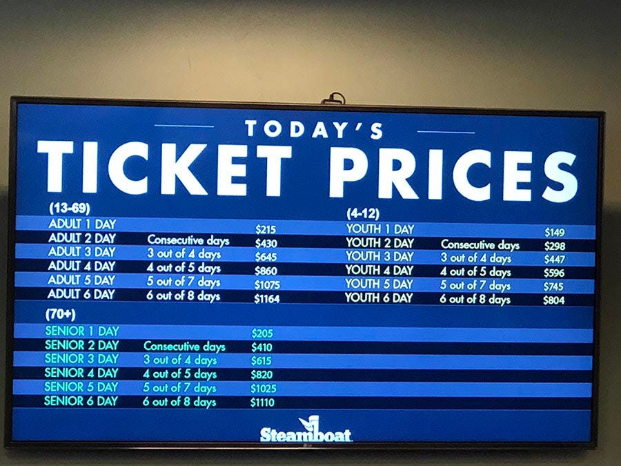So I was in Steamboat this weekend and at the end of the day I went into the ticket office to buy mountain coaster tickets. This happens to be where they also sell lift tickets and this is what it costs to ski at Steamboat: