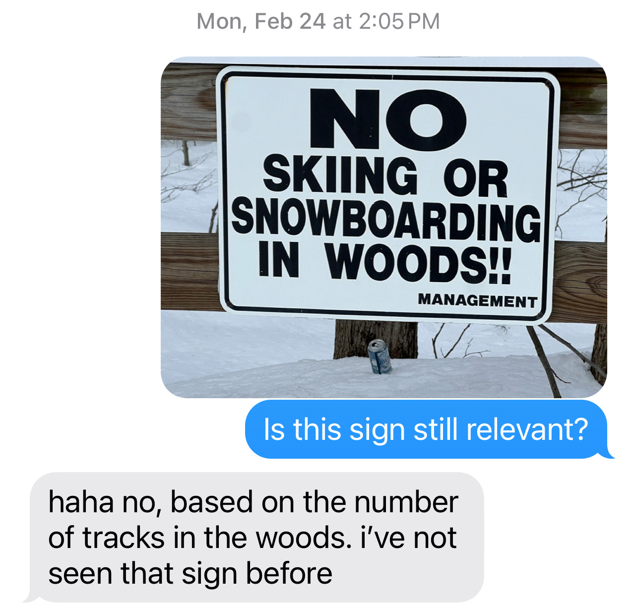 From the lift I texted KB marketing director Pat Morgan to ask him about the stay-off-my-lawn no-tree-skiing-signs still hammered to the summit trailmaps: