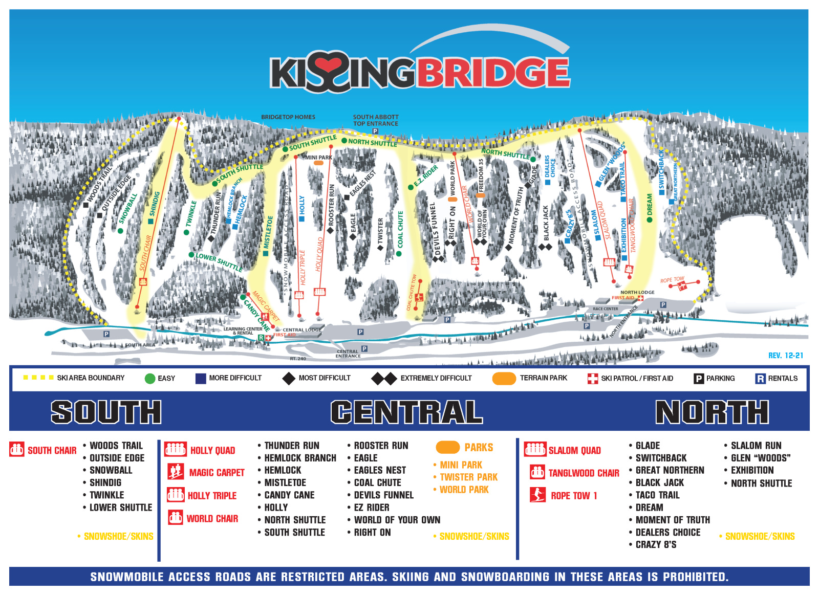 Kissing Bridge could have been a contender. It’s 20 minutes closer to the city, east-facing on a mile-and-a-quarter-wide ridge lined with six chairlifts. But KB took its lake-effect perch for granted. Snowmaking upgrades lagged, and the system covered just half a dozen runs. Whole trailpods would sit dormant for entire winters. Midseason closures became common. The mountain’s snow reports were too often an excuse factory for why Kissing Bridge would again fail to meet customer expectations for a fully open ski area in the middle of winter in one of America’s snowiest regions. The ski area’s claim of 700 skiable acres was one of the most suspect in skiing, especially with signs everywhere forbidding tree skiing. The season pass was expensive, seasons were short. The ski area with one of the industry’s most playful names was, frankly, kind of a curmudgeon. Kissing Bridge? More like Celibate Sewer Grate.
