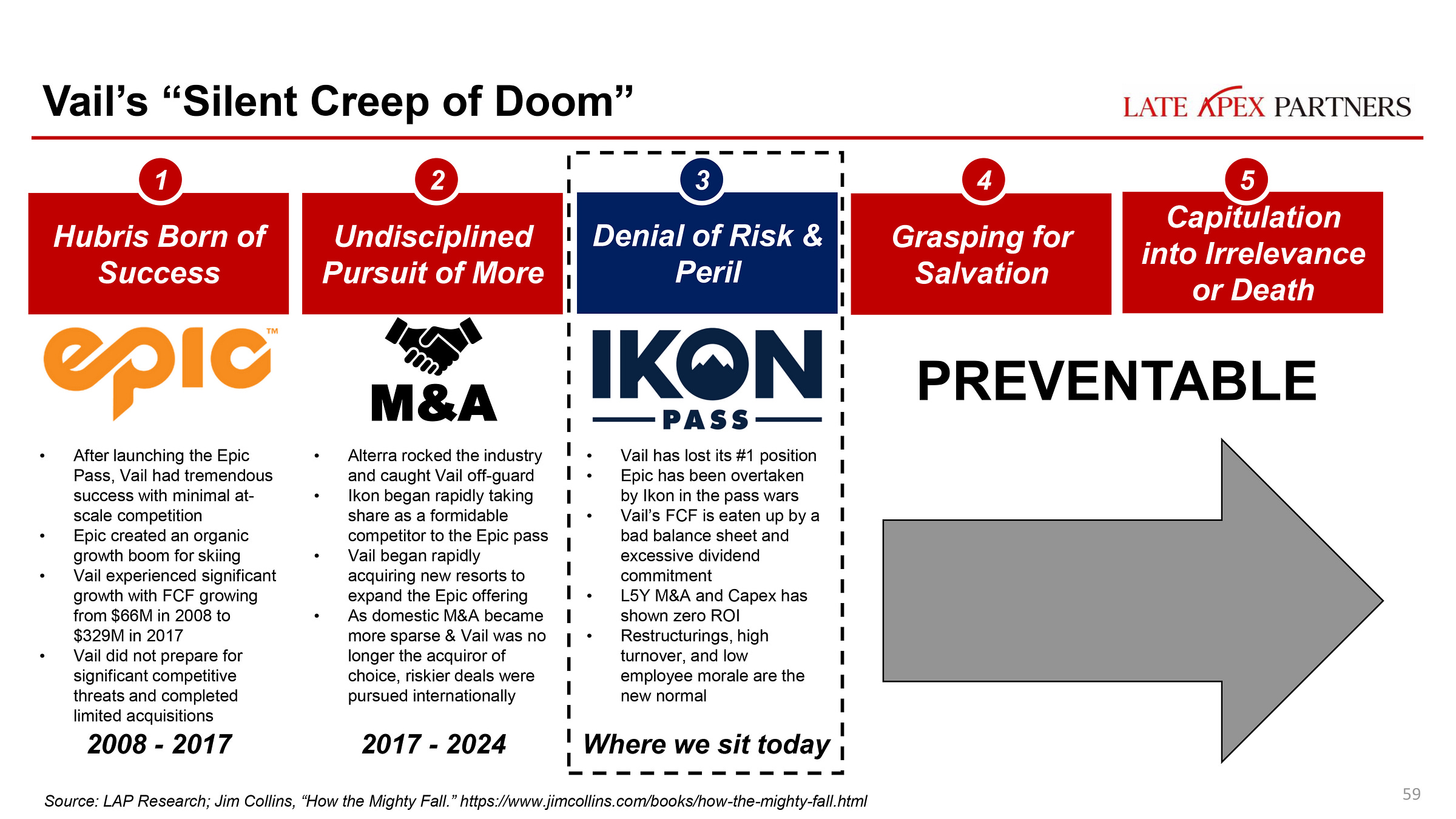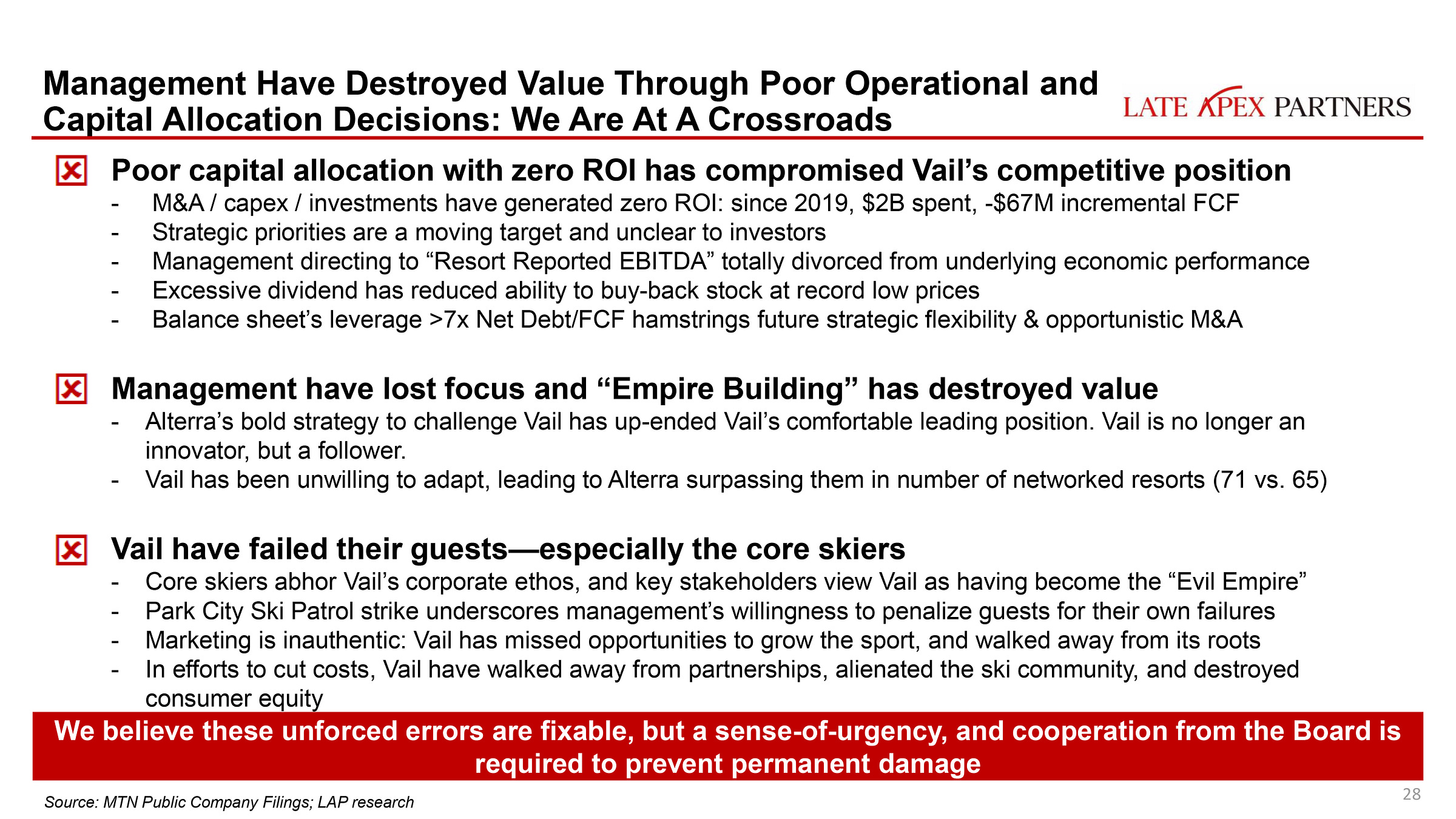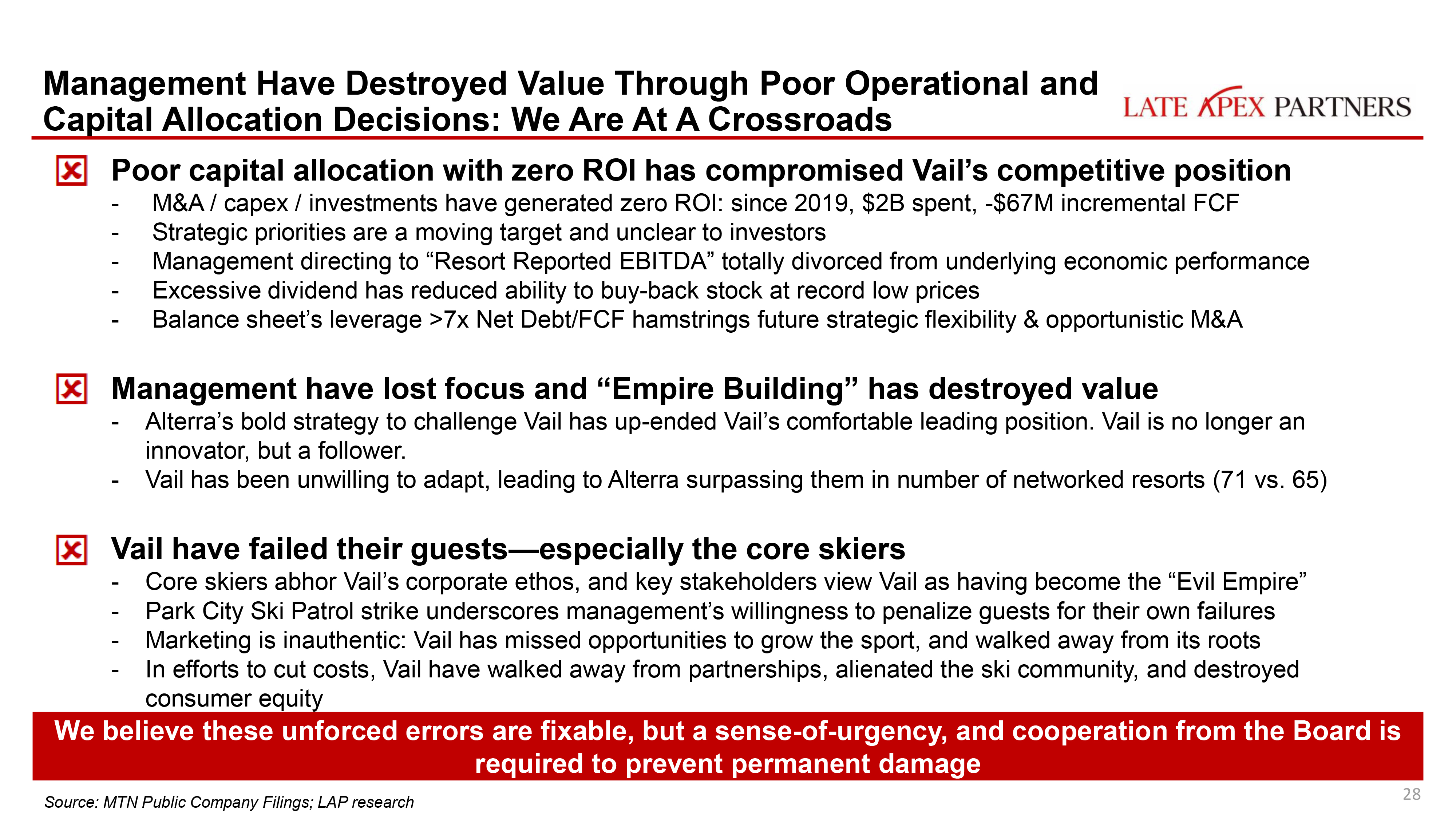 In January, an important-sounding outfit by the name of Late Apex Partners dropped a scalding 88-page dismantling of Vail Resorts’ leadership. The deck presented like the final product of a 10-person activist investor squad assembled at a blue-chip financial firm: dense, detailed, ordered, exhaustive, and aggressive in its certitude that Vail had missed a turn on the access road, plunged off a switchback, and was headed for a fiery crash unless someone sent in a rescue chopper soon.