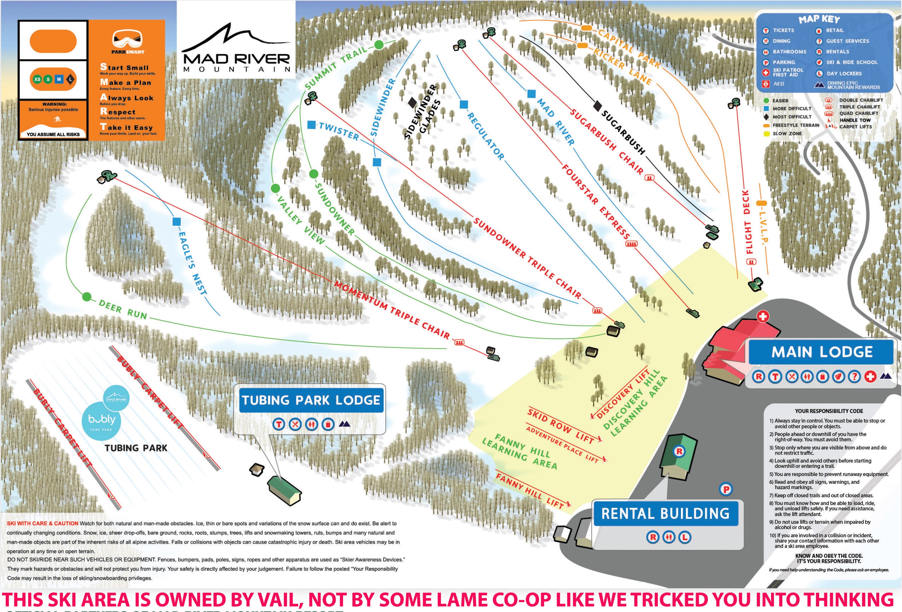 But a true Truth Ninja acts not only in Stealth, but also in Frank Confrontation. And so I calmly approached the customer service desk and demanded to speak to a representative of the co-op. But the clerk behind the counter just kept mumbling something about how “it was only five plays… I shouldn’t a betted alls ah my teeth…” And finally herky-jerky pointed to a large map on the wall. So I went and looked at it. And it looked NOTHING like the fake made-up map on Mad River Glen’s website!!! And at the bottom, written real sneaky and small-like so I could hardly see it, was Mad River’s ultimate secret hiding in plain site: this so-called “independent,” “unique,” “non-commercial” ski area was OWNED BY FUCKING VAIL!!!!!