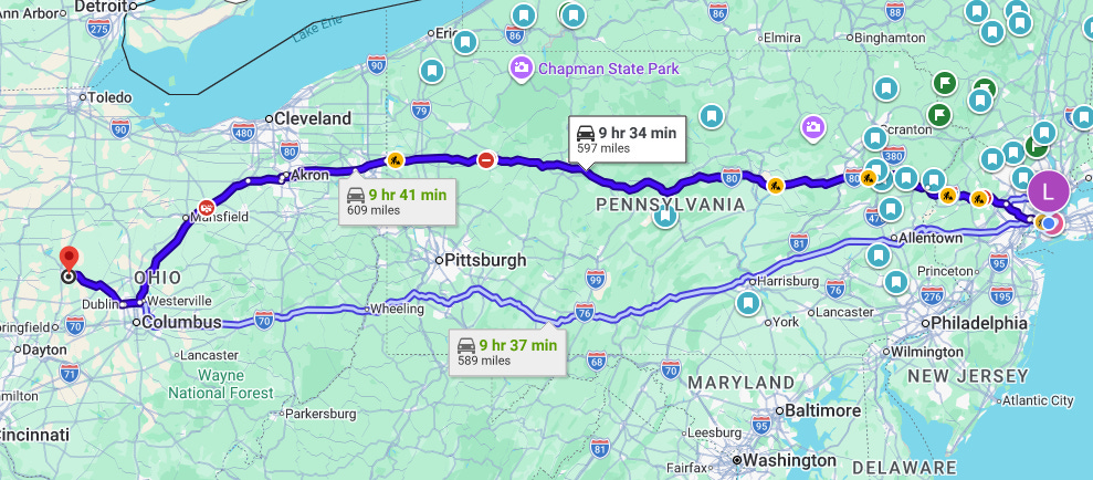 Now, my first hunch that something was wrong was when the robots told me to drive through Pennsylvania. I didn’t remember driving through Pennsylvania the last time I drove to New England, to ski at Hunter Mountain, but I guessed that the robots must have discovered a shortcut. An average person who isn’t a technology expert such as myself probably would have stopped to second-guess the route, but I know a “LIFE HACK” when I see one!!!!!