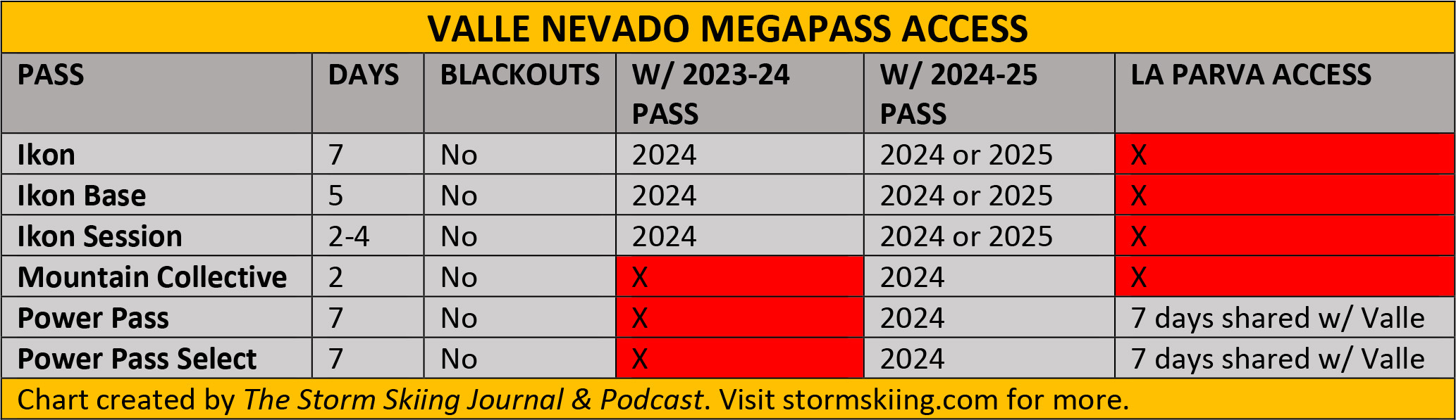 Mountain Collective and Ikon Pass holders can still access Valle Nevado this summer, but they’ll have to buy a lift ticket to cross over to La Parva (or interconnected and still independent El Colorado). Access varies between the two products, and this past season’s Mountain Collective pass will not get you into Valle. Last winter’s Power Passes have also expired for South America access, so you’ll have to throw down for next winter’s pass to get the seven days this year. Here’s how Valle Nevado access breaks down across the various passes: