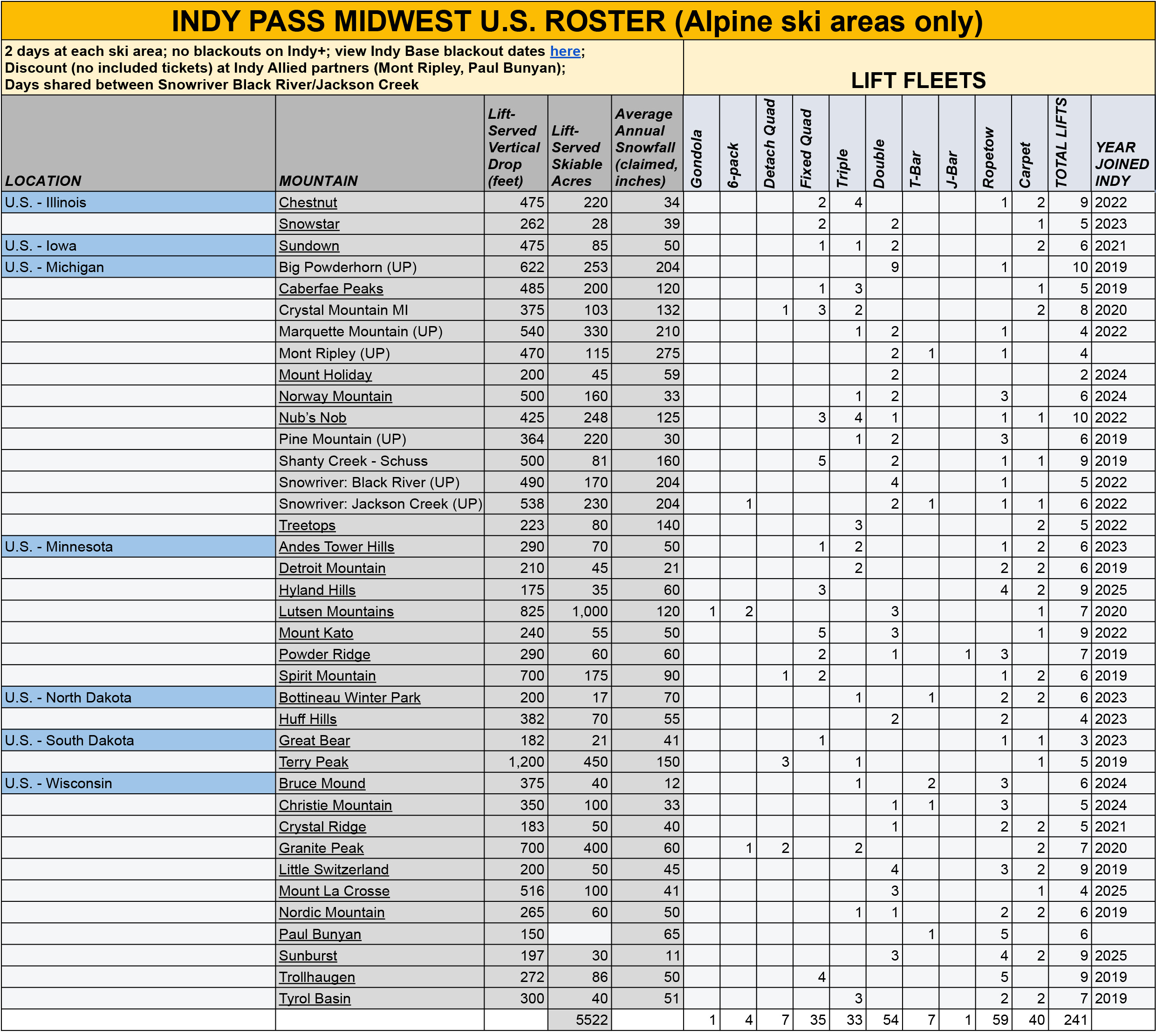 Nowhere is this truer than the Midwest, where Indy has quickly swept up 43 percent of all public ski areas with aerial lifts (38 of 89 total) in the 10-state region, and giving passholders access to nearly half (5,522) of its 11,894 skiable acres: