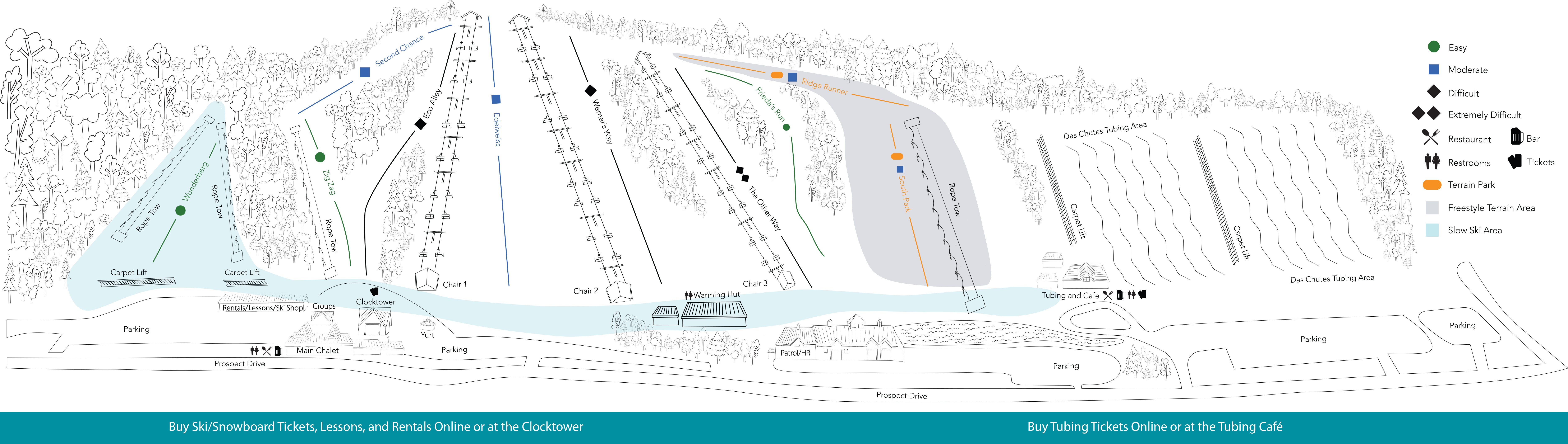OK here’s what really amazes me about Hyland: it is the absolute king of the small-mountain, bullet-train-fast park tow. The tow in the beginner area, running alongside the carpets, is a slow-moving progression lift to help novices adapt to tows (man I coulda used that progression circa 1992). But the red line slicing between the North and South terrain park is what makes HH the prototypical small-mountain, big-air Do-It-For-The-Kids ski center. That one line is actually two side-by-side ropetows, which absolutely hammer up the incline. Fast laps all night = phenomenal lifelong skiers in a place that would otherwise have a hard time keeping them interested. And at very low cost compared to chairlifts.