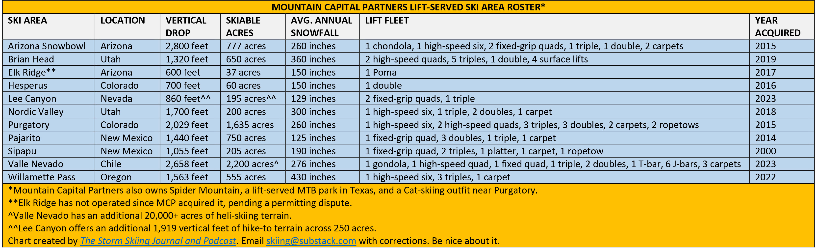 Mountain Capital Partners has been the fastest-growing U.S. ski conglomerate over the past year, adding three new ski areas: Willamette Pass, Oregon (as operator); Valle Nevado; and Lee Canyon, Nevada. Here’s how the company’s current roster stacks up: