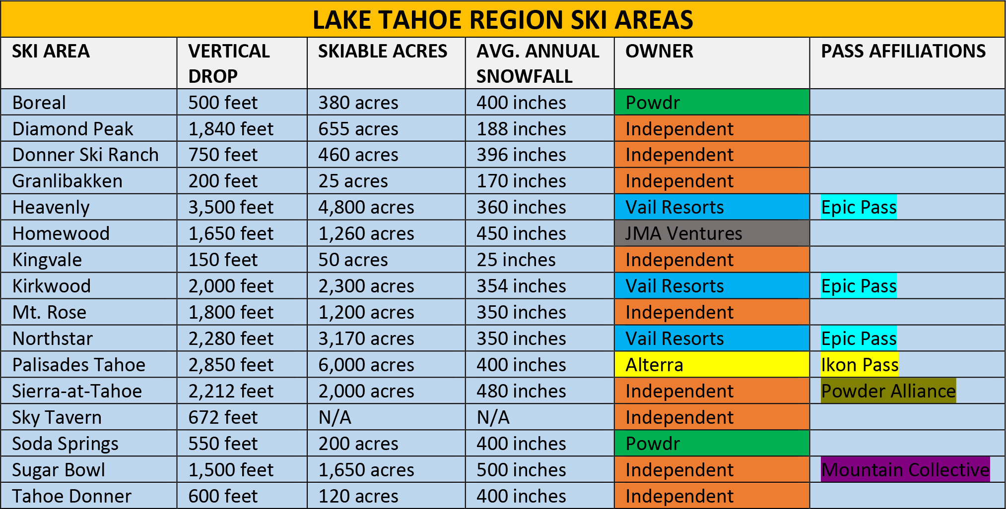 Tahoe hosts one of the densest clusters of ski areas in North America. Here are the 16 currently in operation: