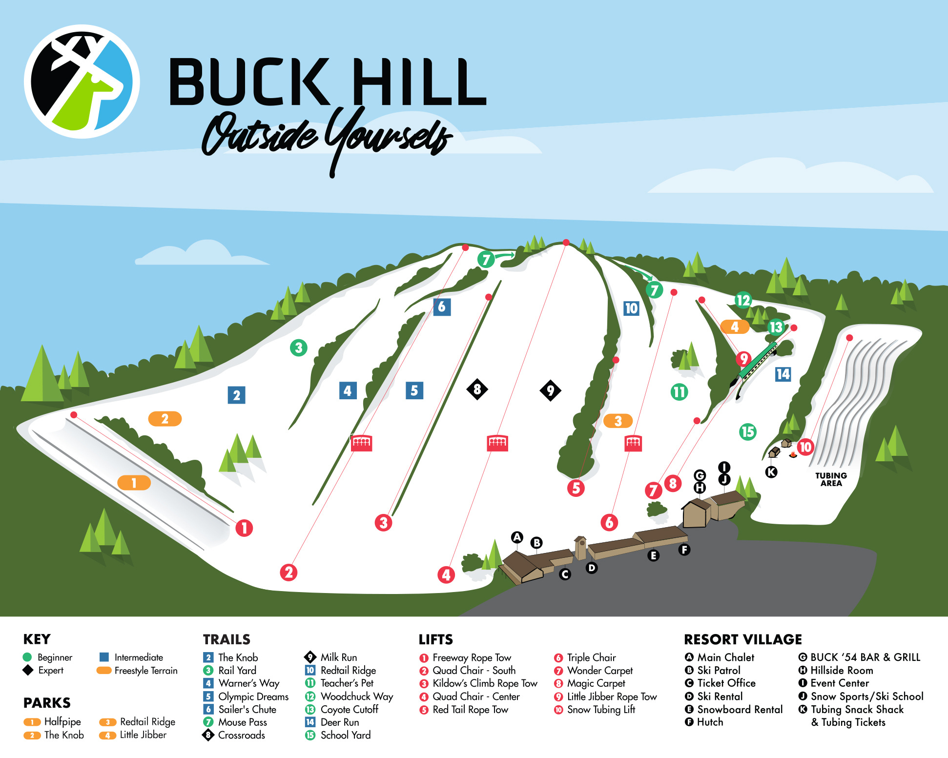 Lift count: 9 (2 fixed-grip quads, 1 triple, 4 ropetows, 2 conveyors - view Lift Blog’s inventory of Buck Hill’s lift fleet)