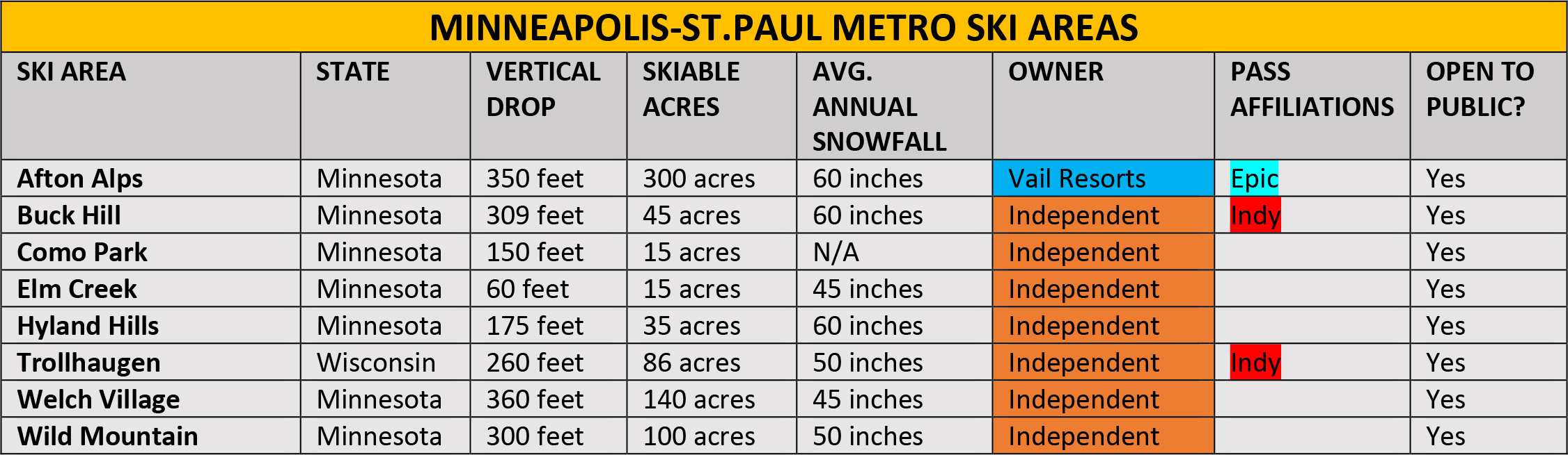 Closest neighboring ski areas: Hyland Hills (:21), Como Park (:33), Afton Alps (:41), Elm Creek (:43), Welch Village (:46)