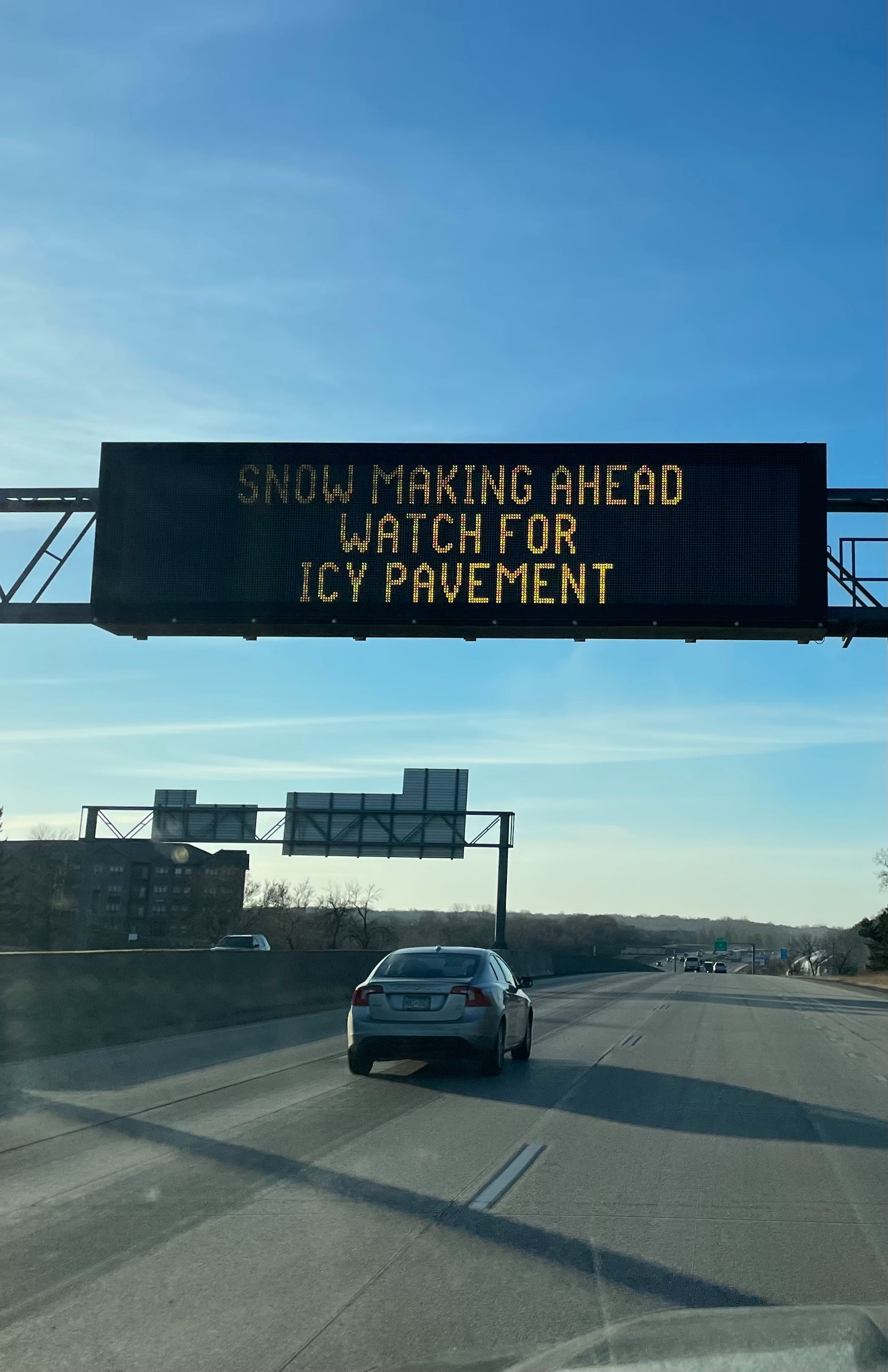 Birr sent me this photo of the warning signs MDOT lights up on Interstate 35 when Buck Hill is making snow: