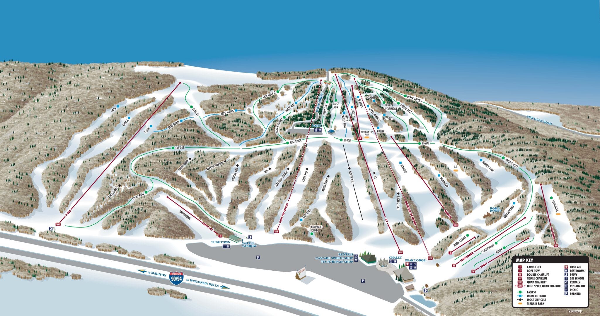 Closest neighboring ski areas: Blackhawk Ski Club (:21), Devil’s Head (:46), Cascade (1:00), Christmas Mountain Village (1:02)