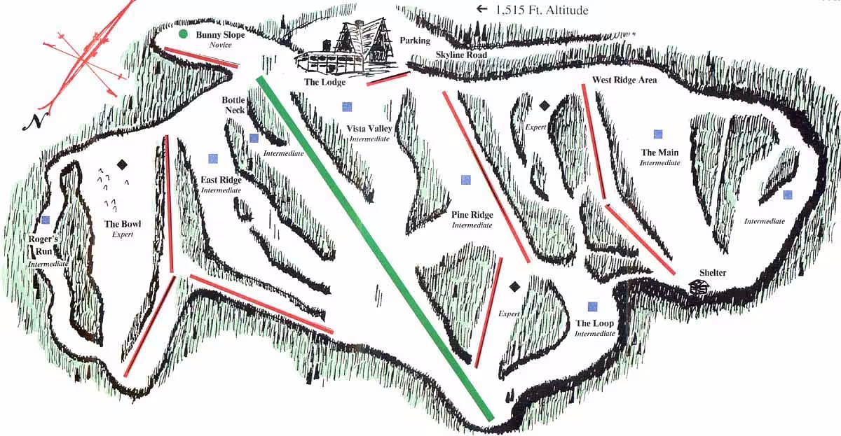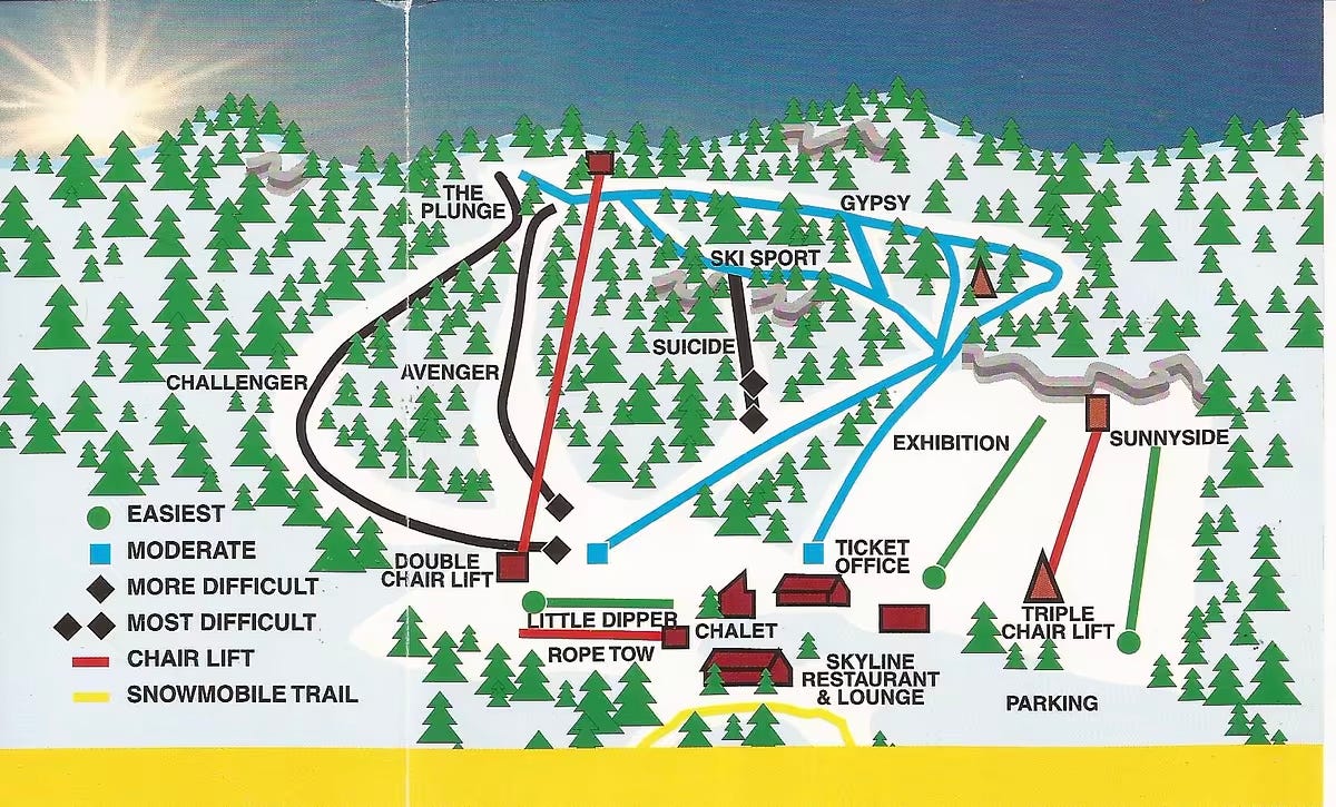 Don’t confuse this with the lost Skyline ski area in Michigan. That’s in Grayling, only an hour north of where I grew up. It has great intermediate pitch and an improvisational, eclectic trail and lift network, but no snowmaking. This just doesn’t work in Michigan anymore (unless you’re Mount Bohemia). The green line is a chairlift, and all the red lines are ropetows: