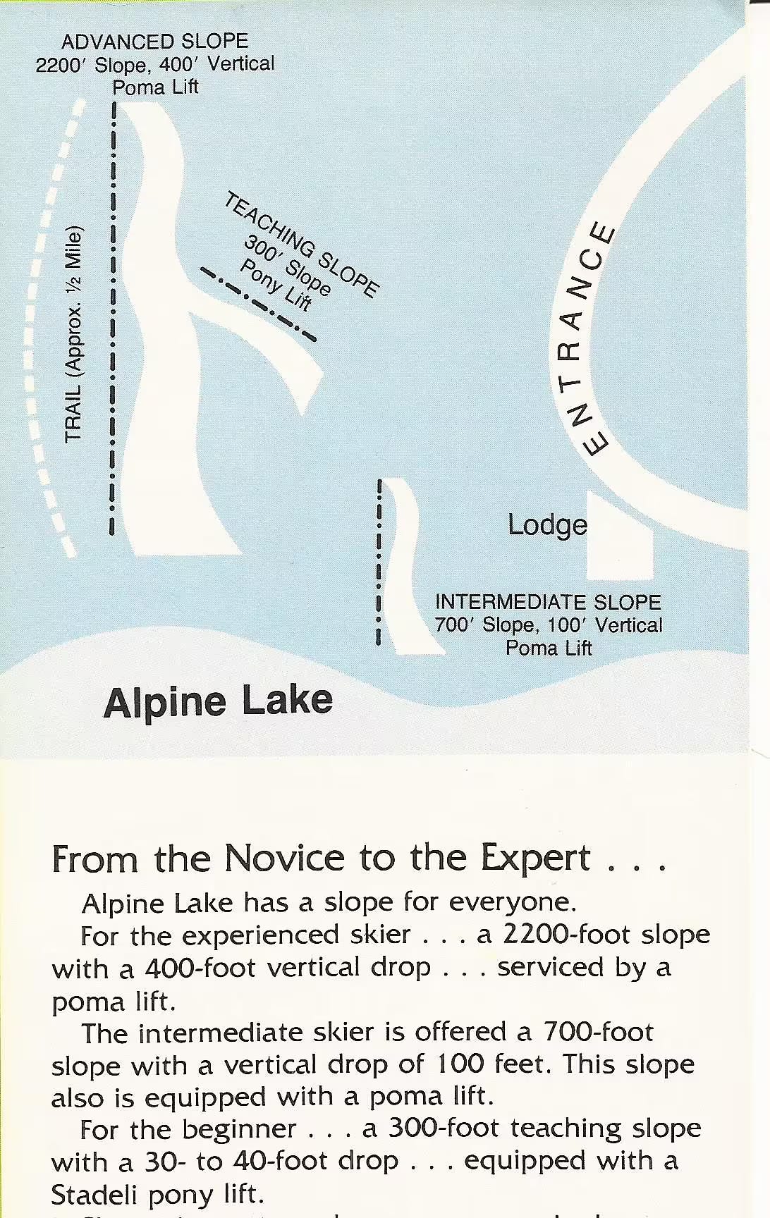 According to Chase, the Bartons went on to have some involvement in a “ski area up at Alpine Lake.” This was, according to DC Ski, a 450-footer with a handful of surface lifts. Here’s a circa 1980 trailmap: