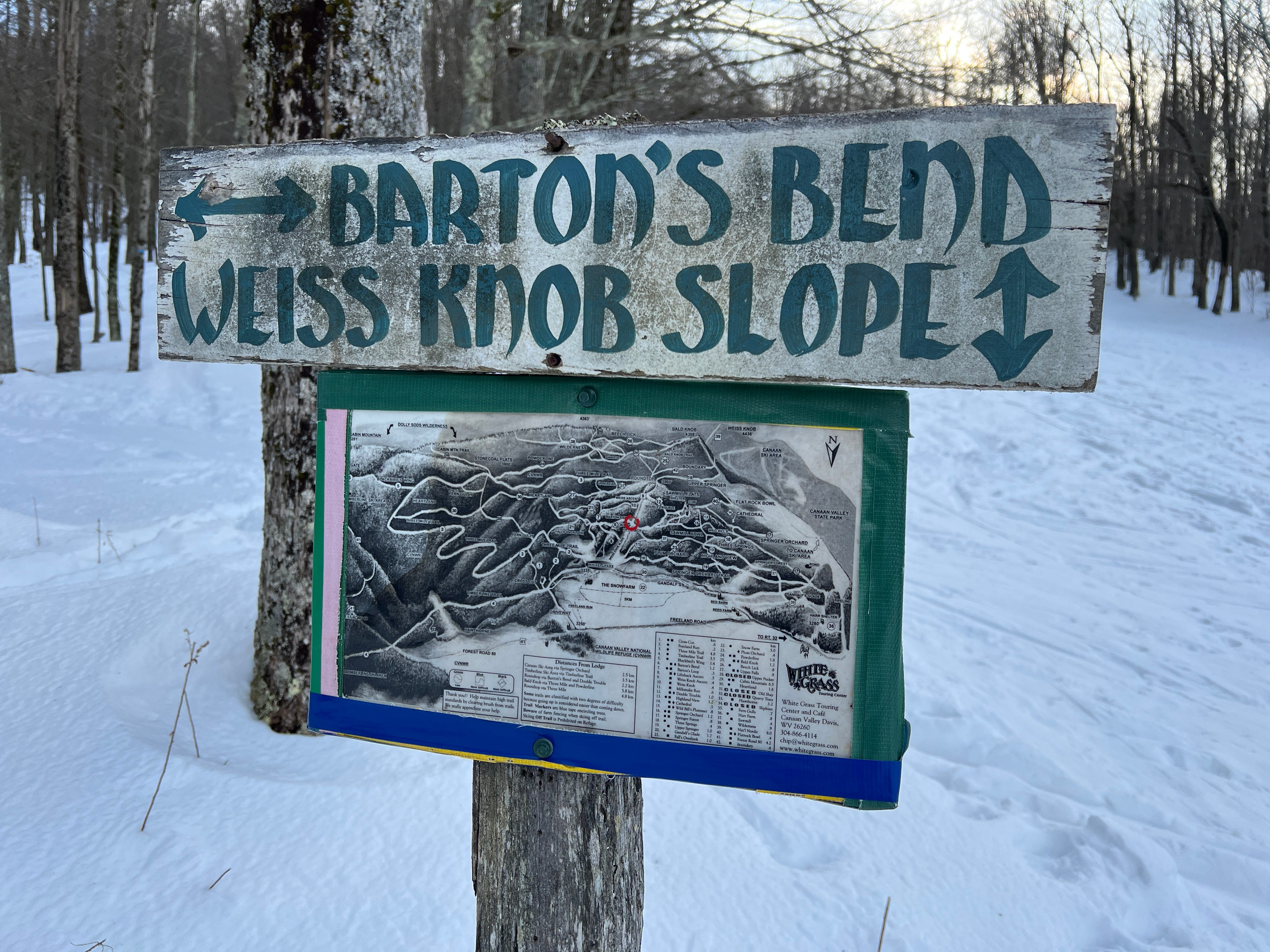 I can’t find any trailmaps for Weiss Knob, the legacy lift-served ski area that White Grass is built on top of. But Chip and his team have kept the main trail clear: