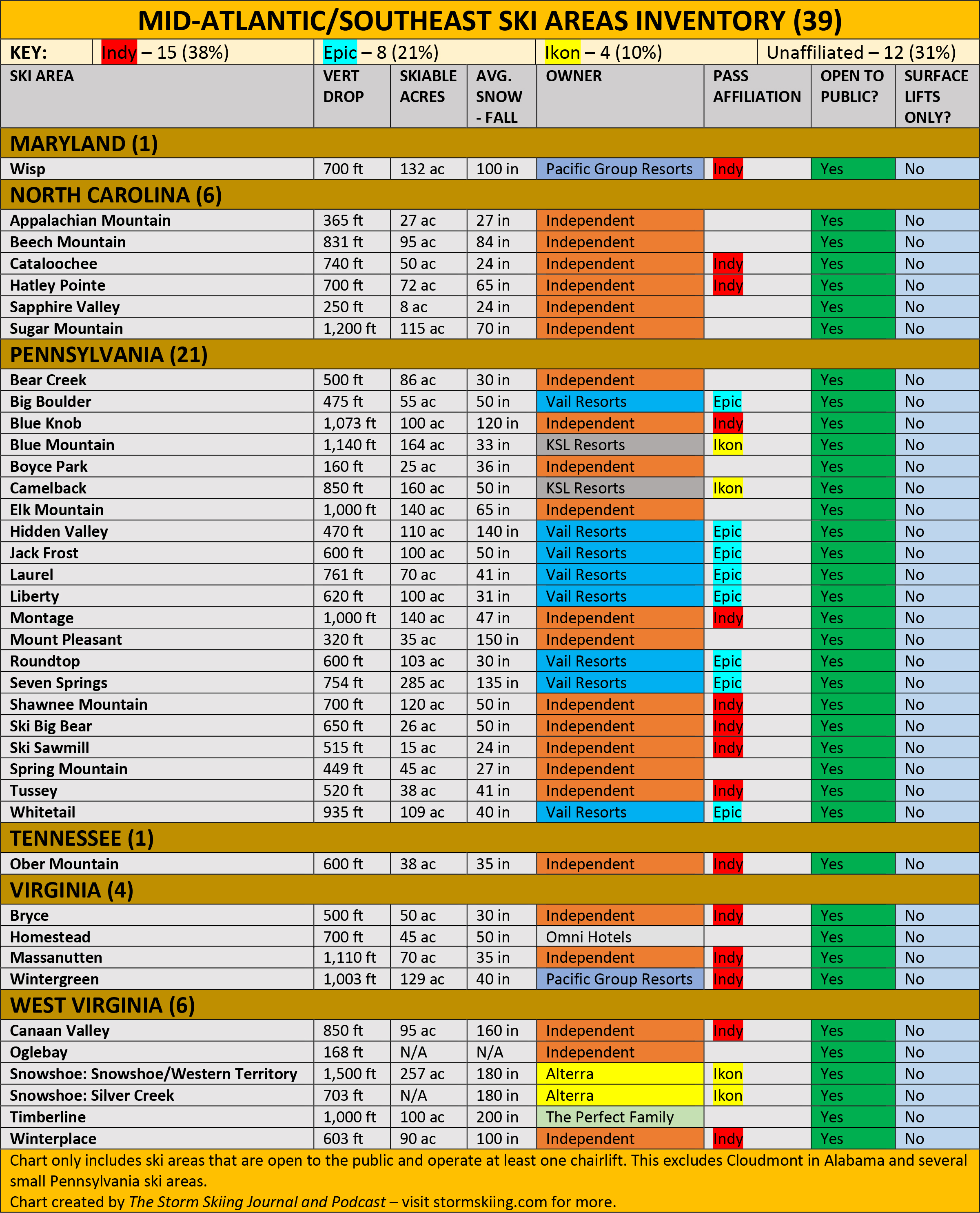 No one really agrees on what Southeast skiing is. The set of ski states I outline above is the same one that Ski Southeast covers. DC Ski includes Pennsylvania (home to another 20-plus ski areas), which from a cultural, travel, and demographic standpoint makes sense. Things start to feel very different in New York, though Open Snow’s Mid-Atlantic updates include all of the state’s ski areas south of the Adirondacks.