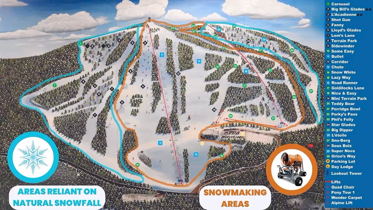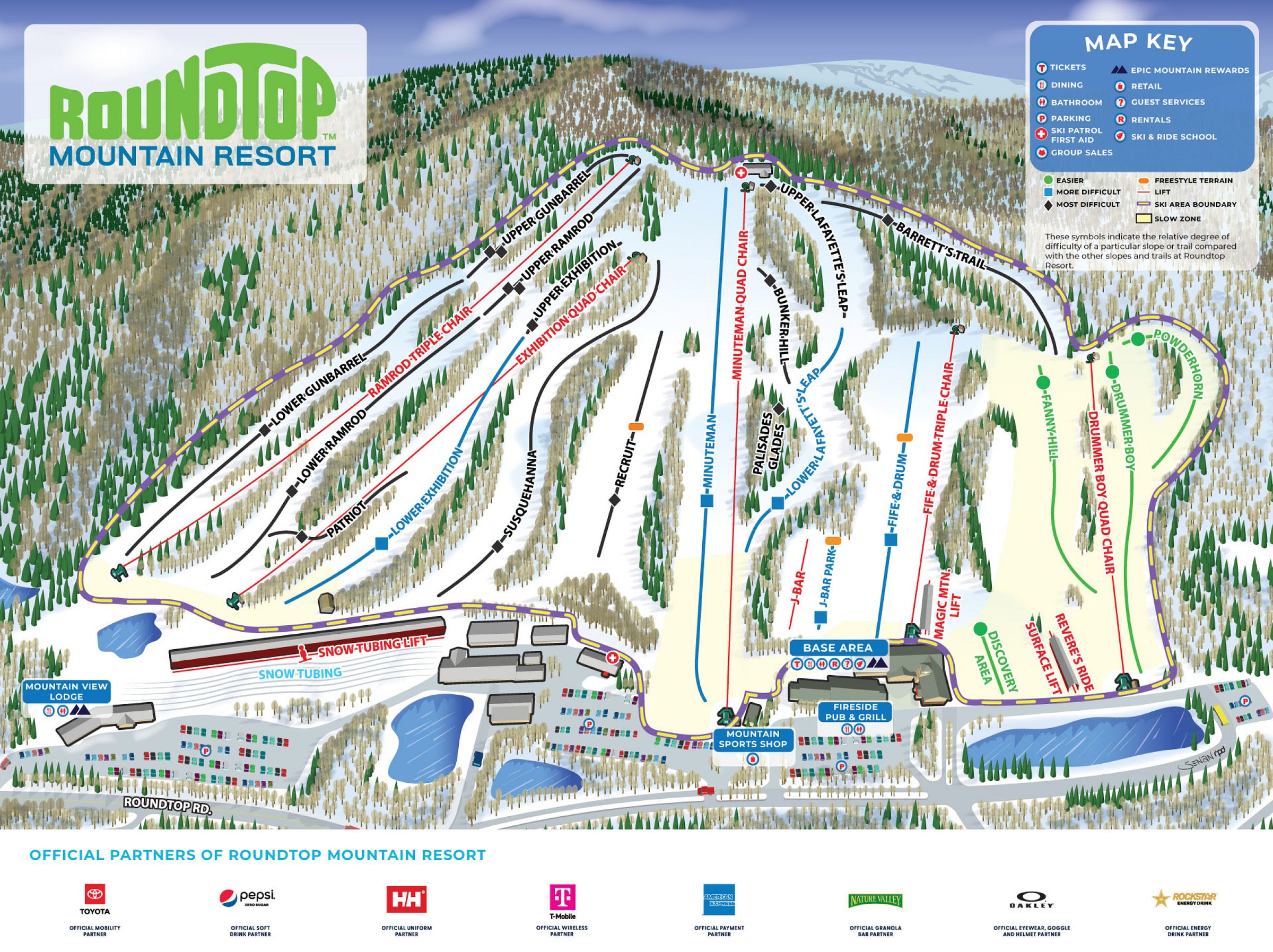 Cohen learned to ski at Roundtop, Pennsylvania, a 600-vertical-foot bump that’s now owned (along with seemingly everything else in the state), by Vail Resorts. The ski area only averages 30 inches of snow per winter, making it a case study in snowmaking’s potential to push skiing through the weather apocalypse. Roundtop delivers some terrific fall line runs, and it skis bigger than this trailmap makes it look: