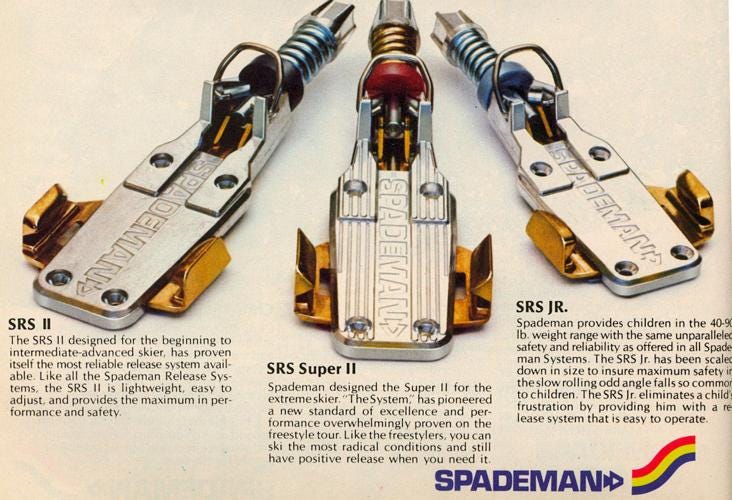 I’m not much of a gear aficionado, and I sort of just nodded along when Cohen was describing his history peddling Spademan bindings in his Summit County yesteryears. But I looked them up afterwards and gosh these things sound pretty great – per Retro Skiing: