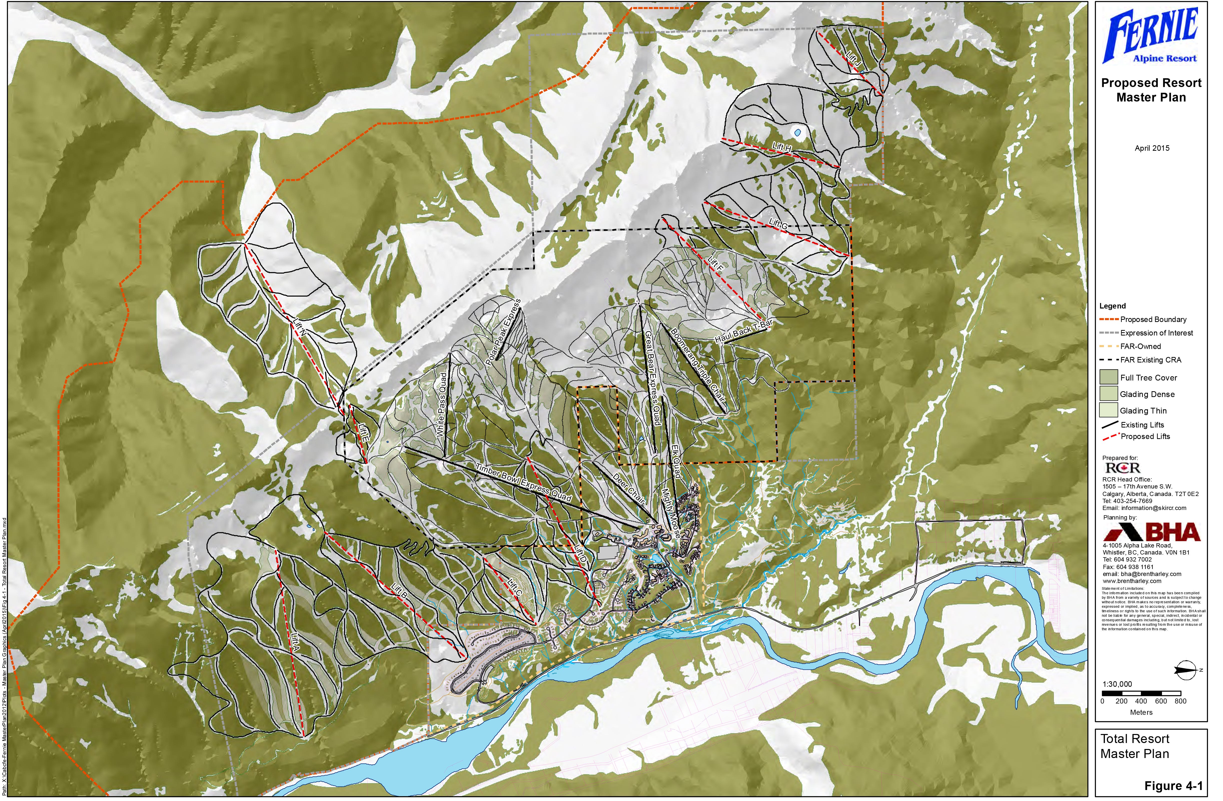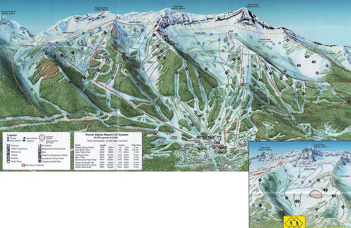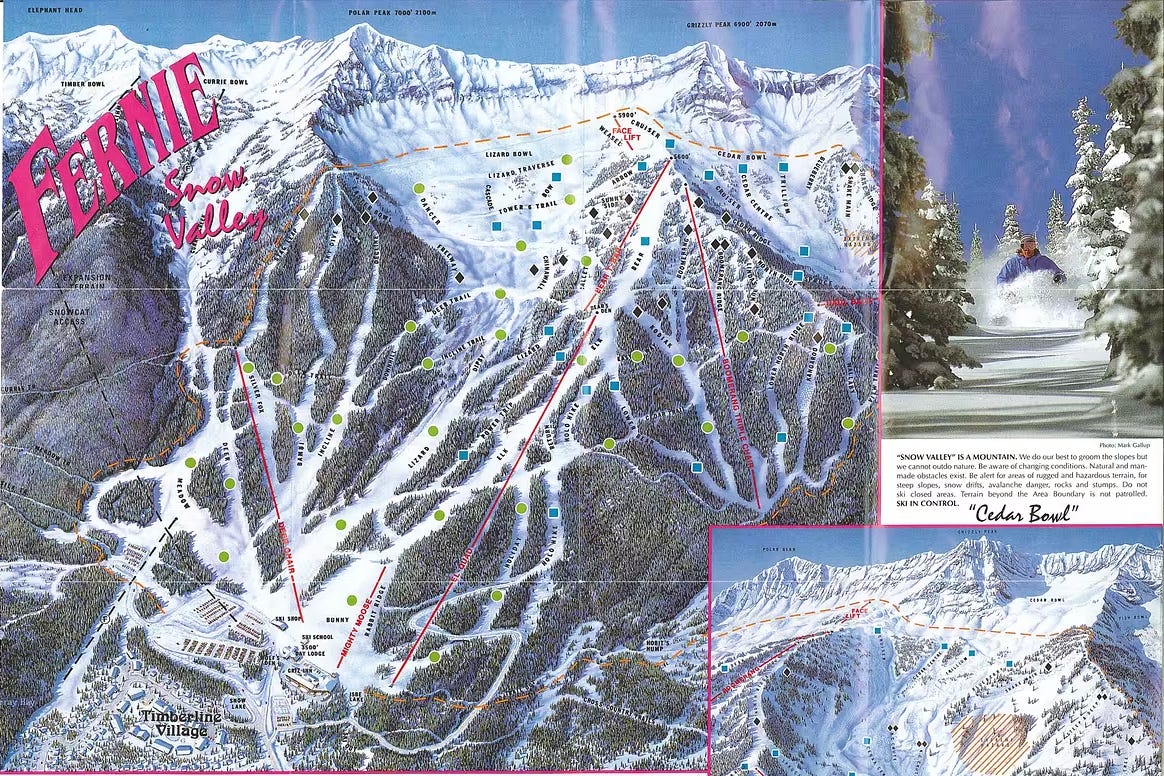 Like so many B.C. ski areas, Fernie was, for decades, a relatively small operation crowded at the base of a huge mountain. Here’s a 1996 snapshot of the resort boundaries and rustic lift network: