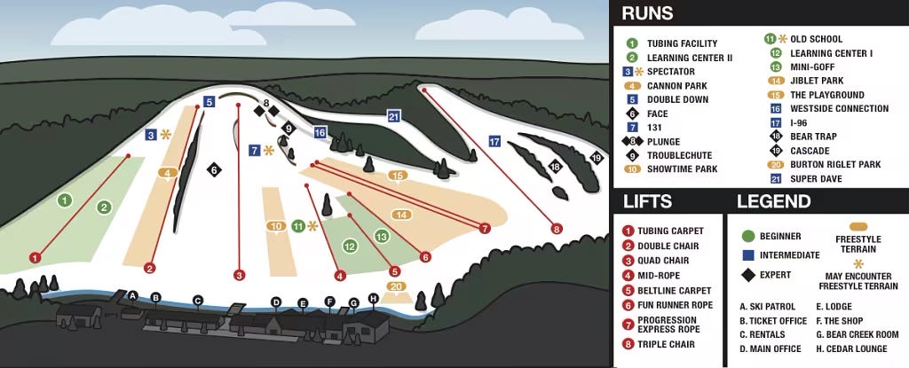 One of Hoppe’s (and my) favorite ski areas is Caberfae. This was my go-to when I lived in Central Michigan, as it delivered both decent vert (485 feet), and an interesting trail network (the map undersells it):
