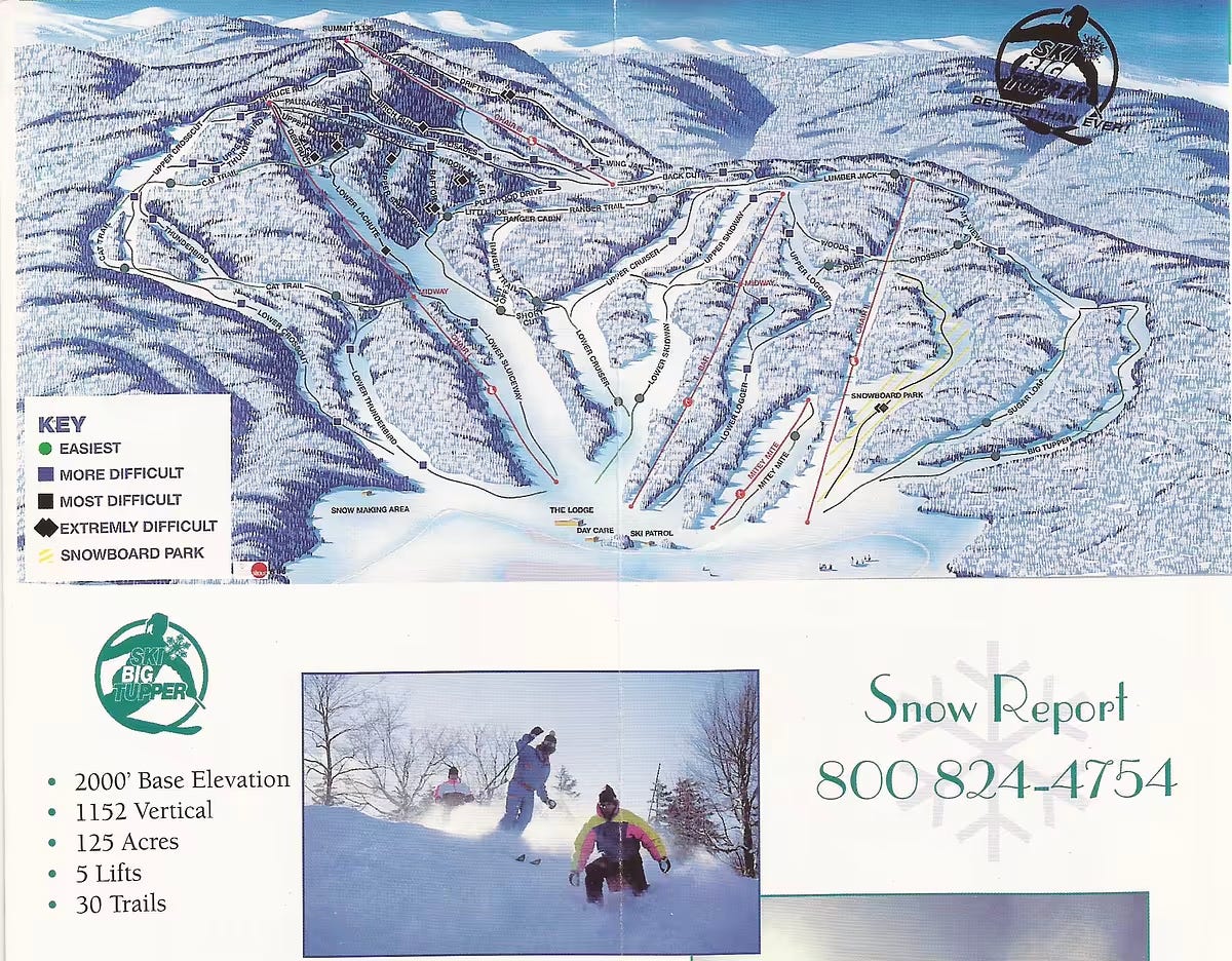 I mention Big Tupper as a lost ski area that will have an extra hard time coming back since it’s been stripped (I think completely), of snowmaking. This ski area isn’t necessarily totally dead: the lifts are still standing, and the property is going to auction next month, but it will take tens of millions to get the place running again. It was at one time a fairly substantial operation, as this circa 1997 trailmap shows: