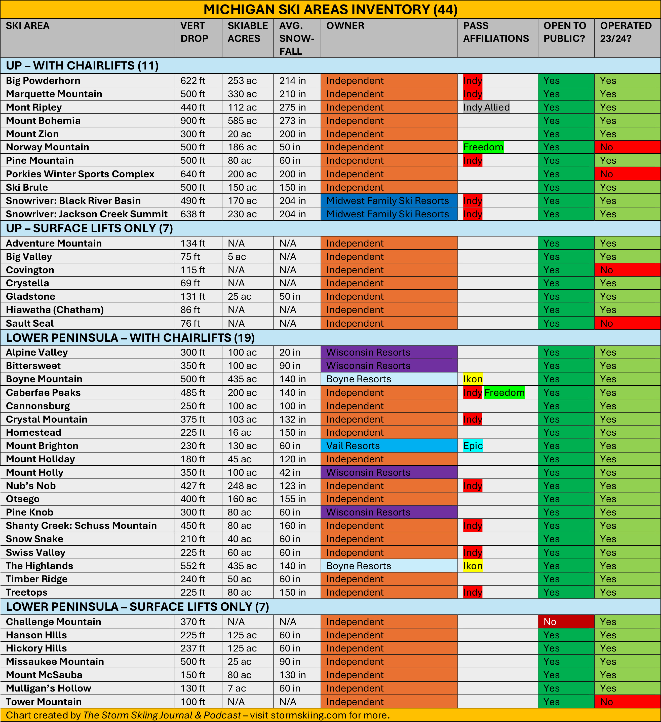 My point is that it’s worth organizing the state’s ski areas in the way that they practically exist in skiers minds. So I’ve separated the UP from the Lower Peninsula. Since Michigan is also home to an outsized number of town ropetows, I’ve also split surface-lift-only operations into their own categories: