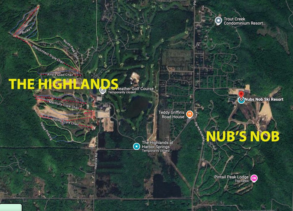 My 17-year-old brain could not comprehend the notion that two ski areas operated across the street from – and independent of – one another. But there they were: Nub’s Nob and Boyne Highlands (now The Highlands), each an opposite turn off Pleasantview Road.