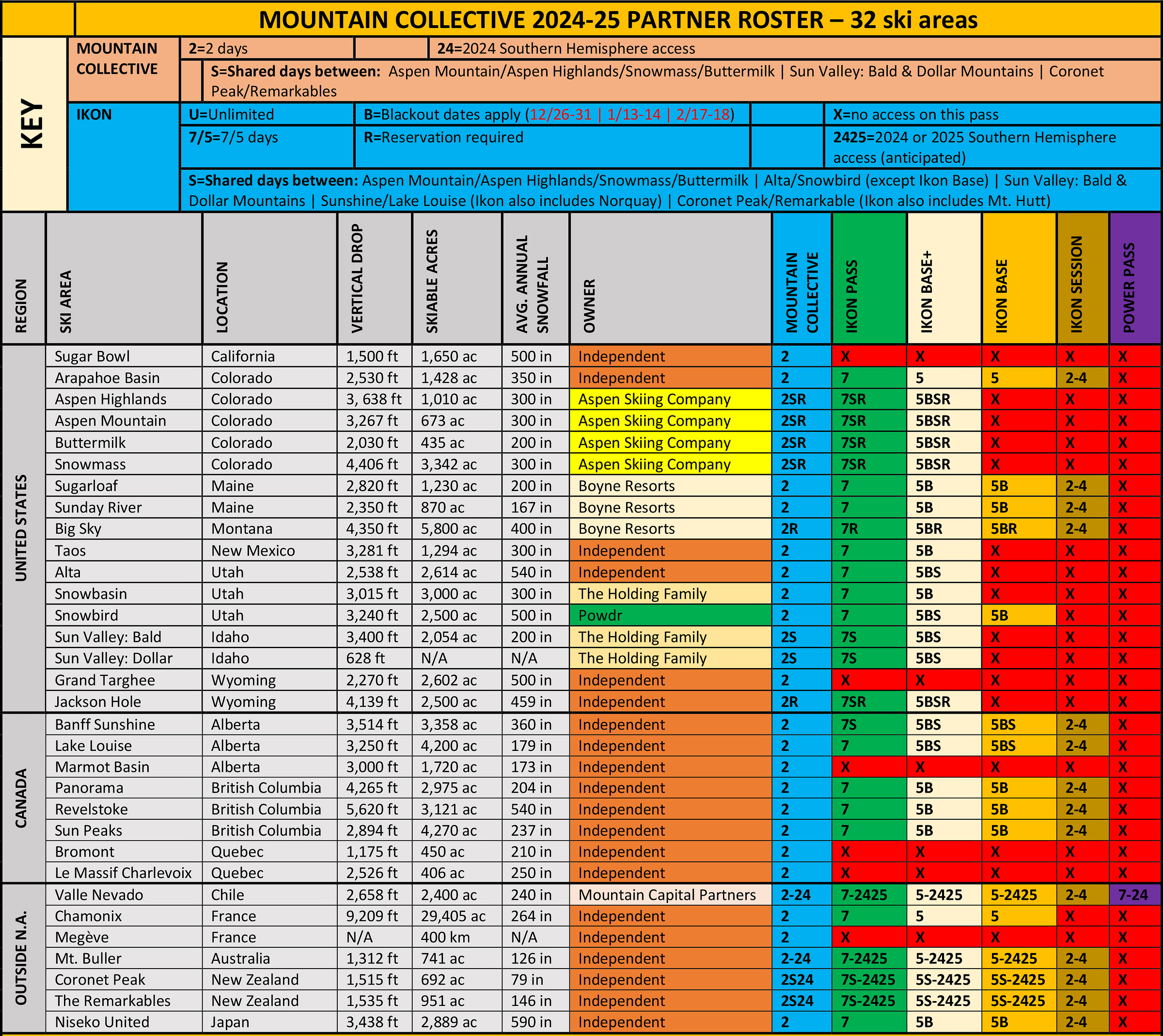 Mountain Collective and Ikon share a remarkable 26 partner ski areas. Only Targhee, Sugar Bowl, Marmot Basin, Bromont, Le Massif du Charlevoix, and newly added Megève have joined Mountain Collective while holding out on Ikon.