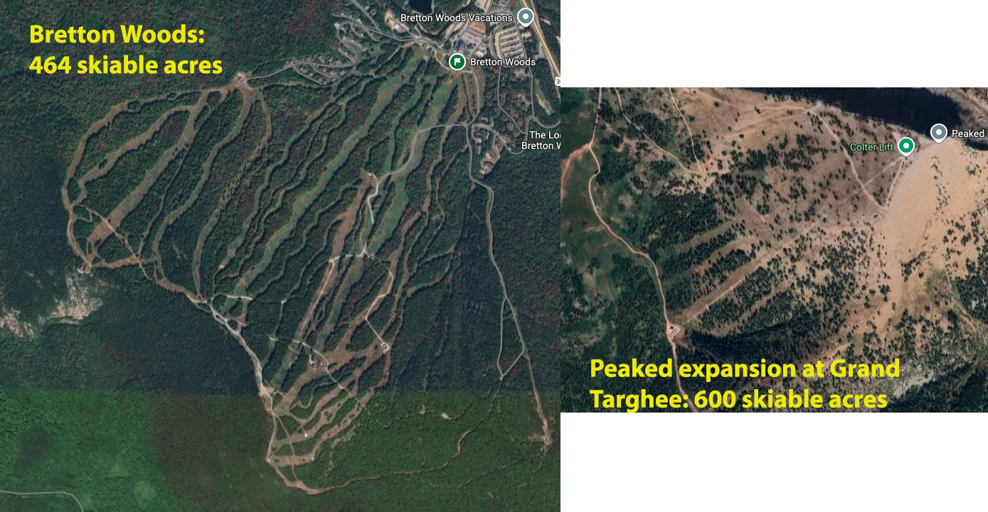 Which is a long way of saying that numbers are hard, and that relying on ski area stats pages for accurate ski area comparisons isn’t going to get you into NASA’s astronaut training academy. Here’s a side-by-side of 464-acre Bretton Woods – New Hampshire’s largest ski area – and Targhee’s 600-acre Peaked Mountain expansion, both at the same scale in Google Maps. Clearly Bretton Woods covers more area, but the majority of those trees are too dense to ski: