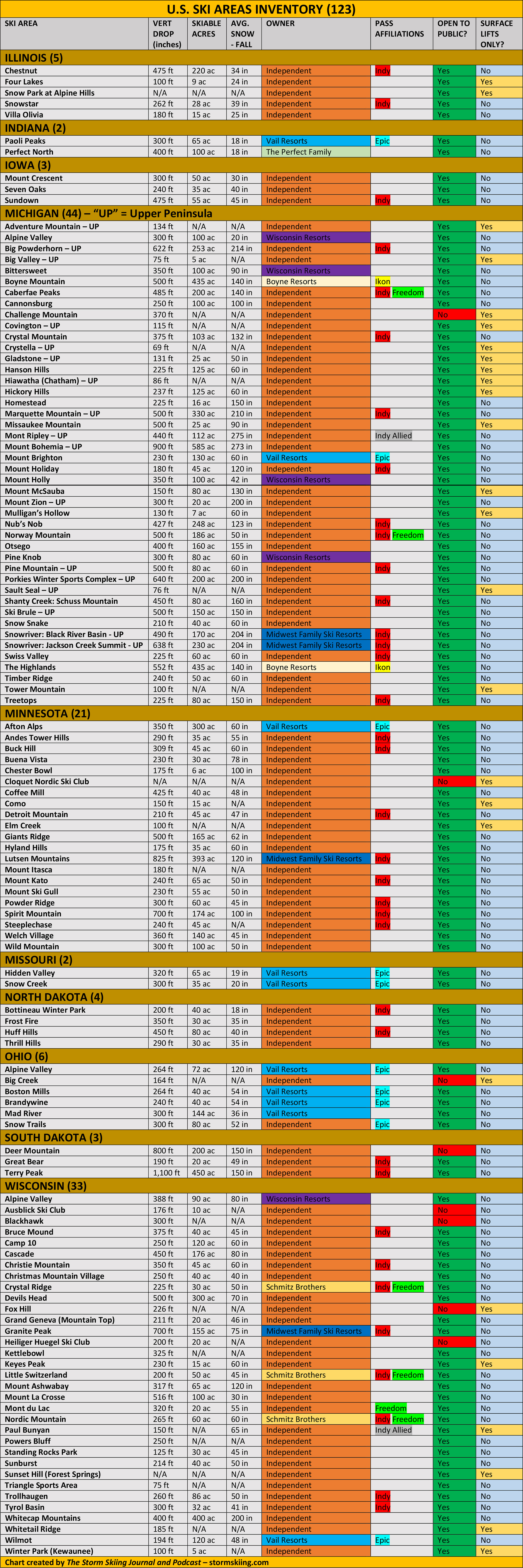 The Midwest has not been sheltered from the consolidation wave that’s rolled over much of the West and New England over the past few decades. Of the region’s 123 active ski areas, 25 are owned by entities that operate two or more ski areas: Vail Resorts owns 10; Wisconsin Resorts, five; Midwest Family Ski Resorts, four; the Schmitz Brothers, three; Boyne, two; and the Perfect Family, which also owns Timberline in West Virginia, one. But 98 of the region’s ski areas remain independently owned and operated. While a couple dozen of those are tiny municipal ropetow bumps with inconsistent operations and little or no snowmaking, most of those that run at least one chairlift are family-owned ski areas that, last winter notwithstanding, are doing very well on a formula of reasonable prices + a focus on kids and night-skiing. Here’s the present landscape of Midwest skiing: