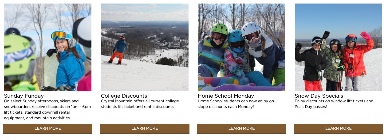 While Crystal is as high-end as any resort you’ll find in Michigan, the ski area still offers numerous loveably kitschy discounts of the sort that every ski area in the country once sold: