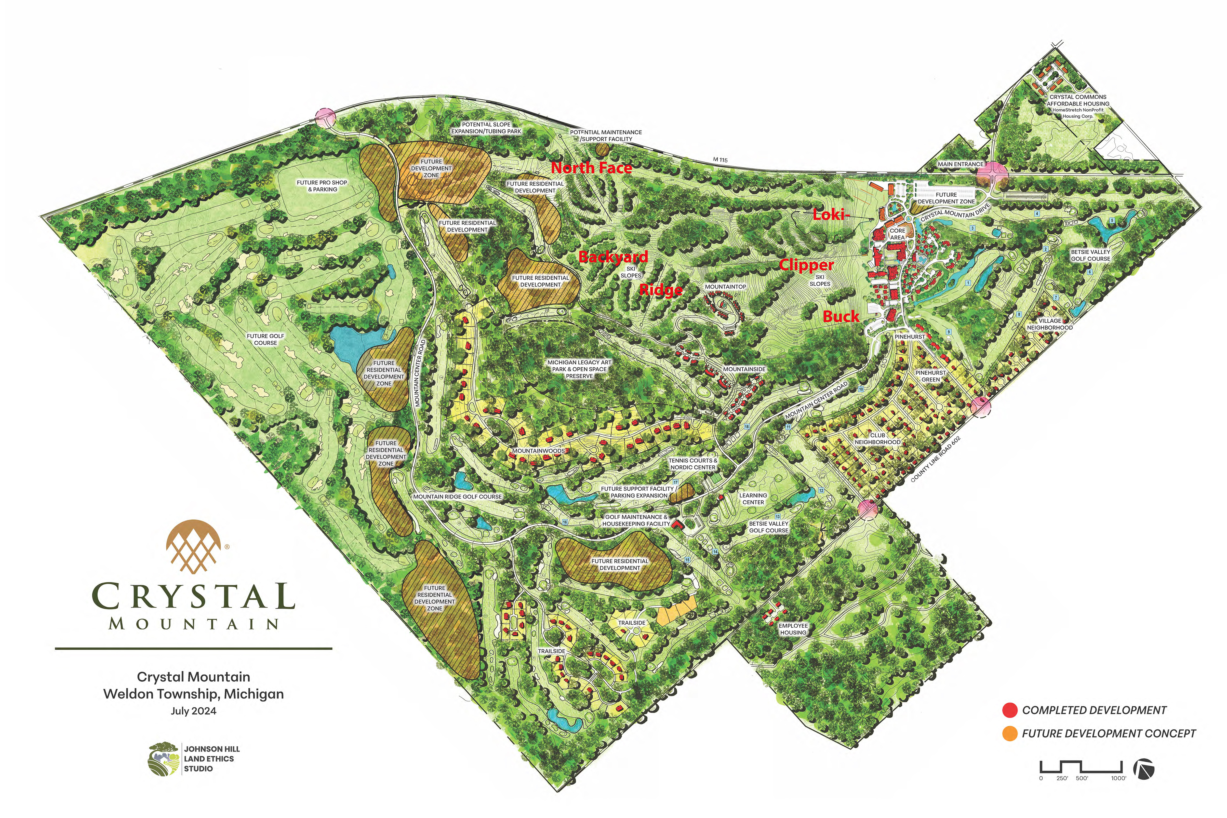 Crystal’s masterplan leaves room for potential future ski development – we discuss where, specifically, in the podcast. The ski area is kind of lost in the sprawl of Crystal’s masterplan, so I’ve added the lift names for context:
