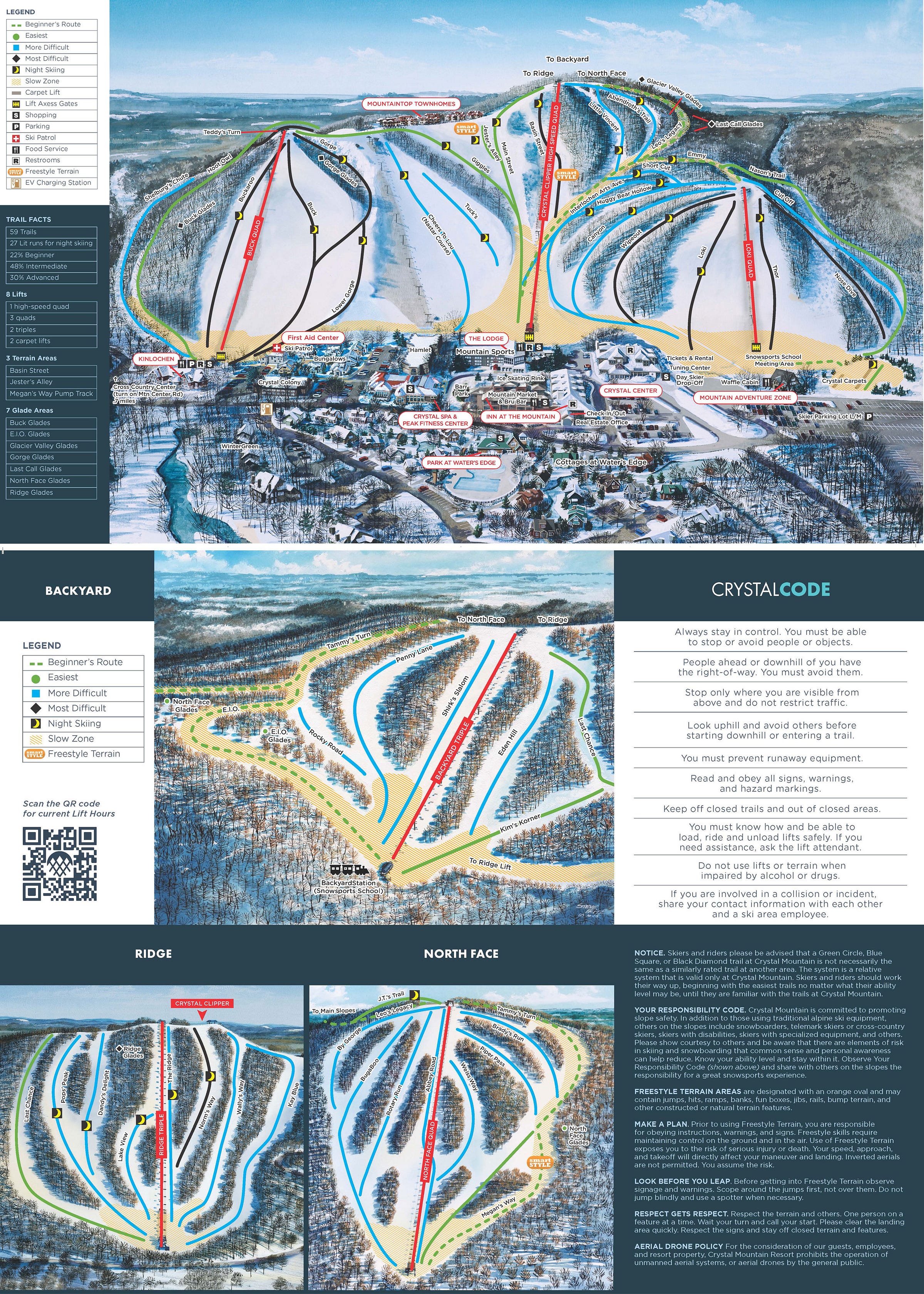 By building pod after pod off the backside of the mountain, Crystal has nearly doubled in size since I first skied there in the mid-90s. The Ridge appeared around 2000; North Face came online in 2003; and Backyard materialized in 2015. These additions give Crystal a sprawling, adventurous feel on par with The Highlands or Nub’s Nob. But the trailmap, while aesthetically pleasant, is one of the worst I’ve seen, as it’s very unclear how the three pods link to one another, and in turn to the front of the mountain: