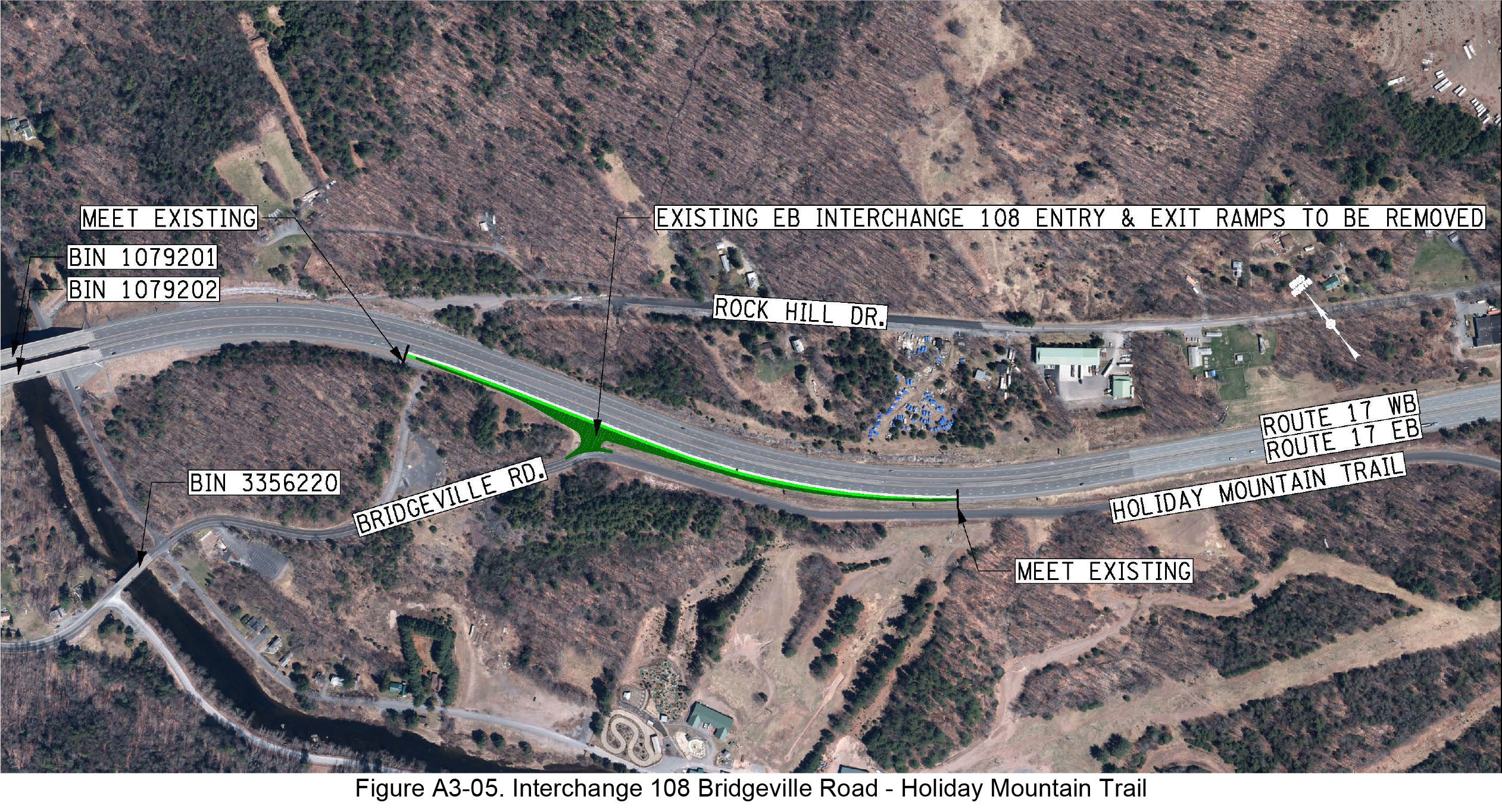 New York 17 is in the midst of a decades-long evolution into Interstate 86, with long stretches of the route that spans southern New York already signed as such. But the interstate designation comes with standards that define lane number and width, bridge height, shoulder dimensions, and maximum grade, among many other particulars, including the placement and length of exit and entrance ramps. Exit 108, which provides direct eastbound access to and egress from Holiday Mountain, is fated to close whenever the highway gods close the gap that currently splits I-86 into segments.