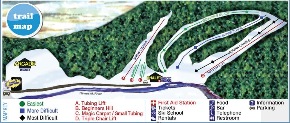 At some indeterminant point, the ski area also abandoned the Turkey Trot double. This 2023 trailmap shows the area dedicated to snowtubing, though to my knowledge no such activity was ever conducted there at scale.