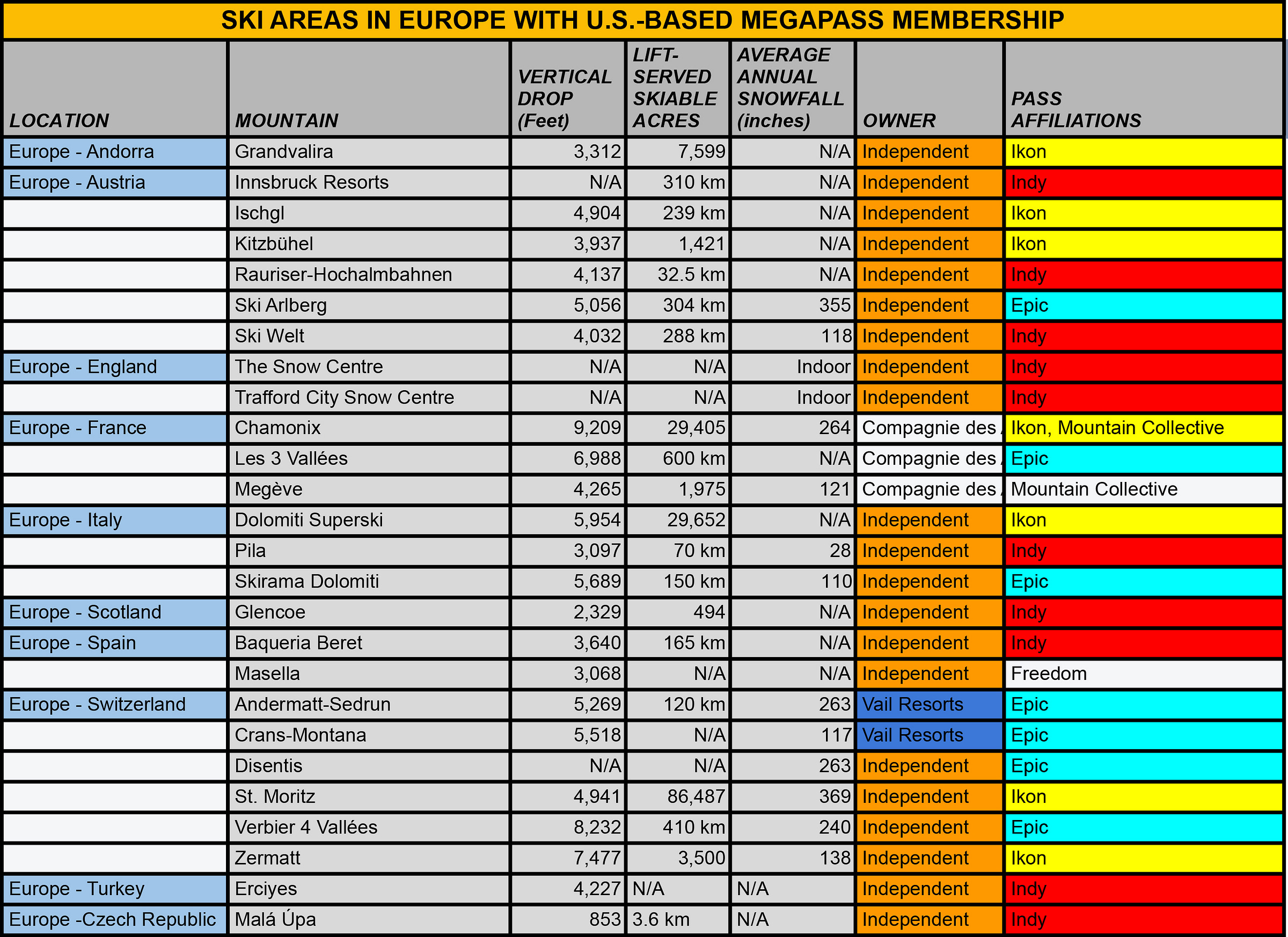 I present to you, again, the EuroSki Chart – a list of all 26 European ski areas that have aligned themselves with a U.S.-based multi-mountain pass: