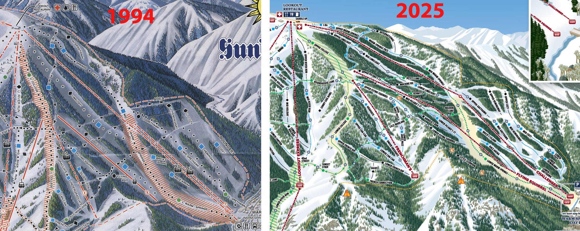 Unfortunately, the ski area chose Yan, whose bungling founder’s shortcuts transformed the machines into deathtraps, as its detachable partner. The ski area heavily retrofit all seven machines in partnership with Doppelmayr in 1995. Sun Valley has so far replaced three of the seven Yans: the Seattle Ridge sixer replaced the detach quad of the same name last year and the Broadway sixer and Flying Squirrel quad replaced the Broadway and Greyhawk quads in 2023, on a new alignment: