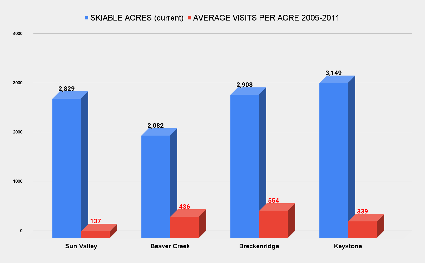 Here’s how those four ski areas compare in size and average skier visits per acre: